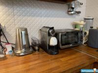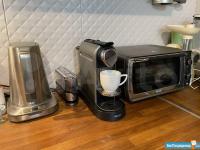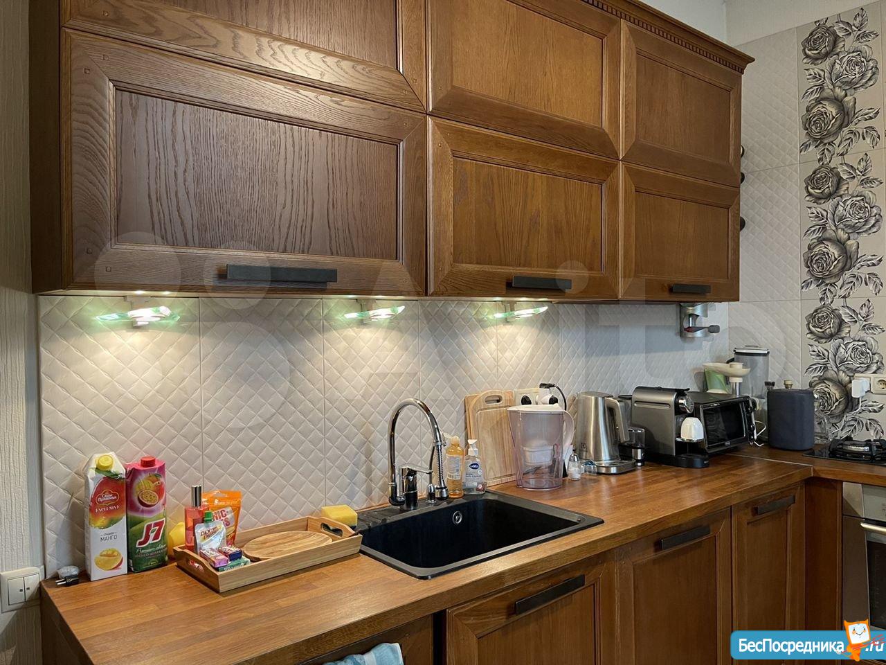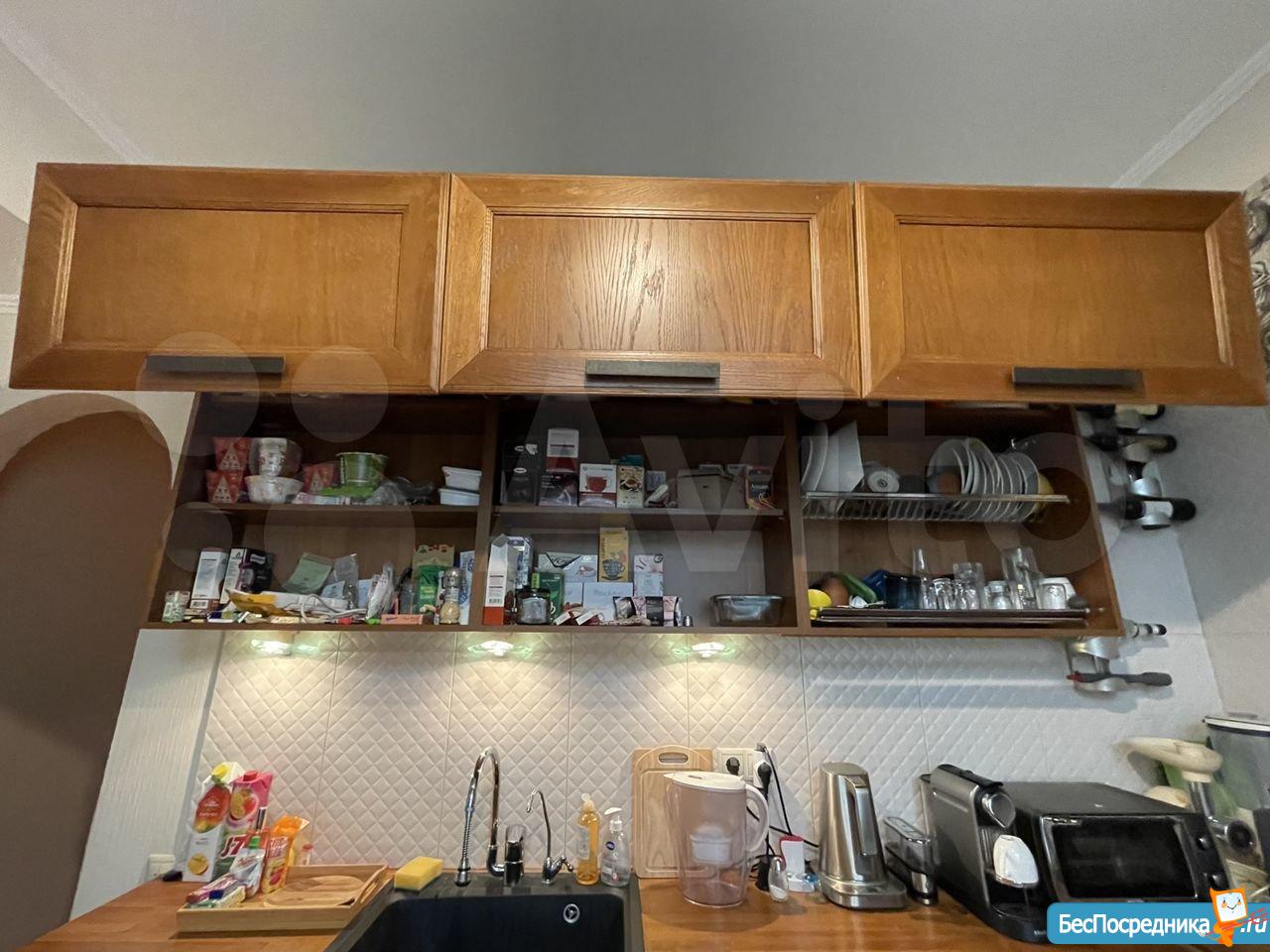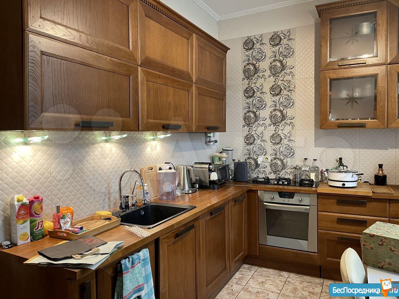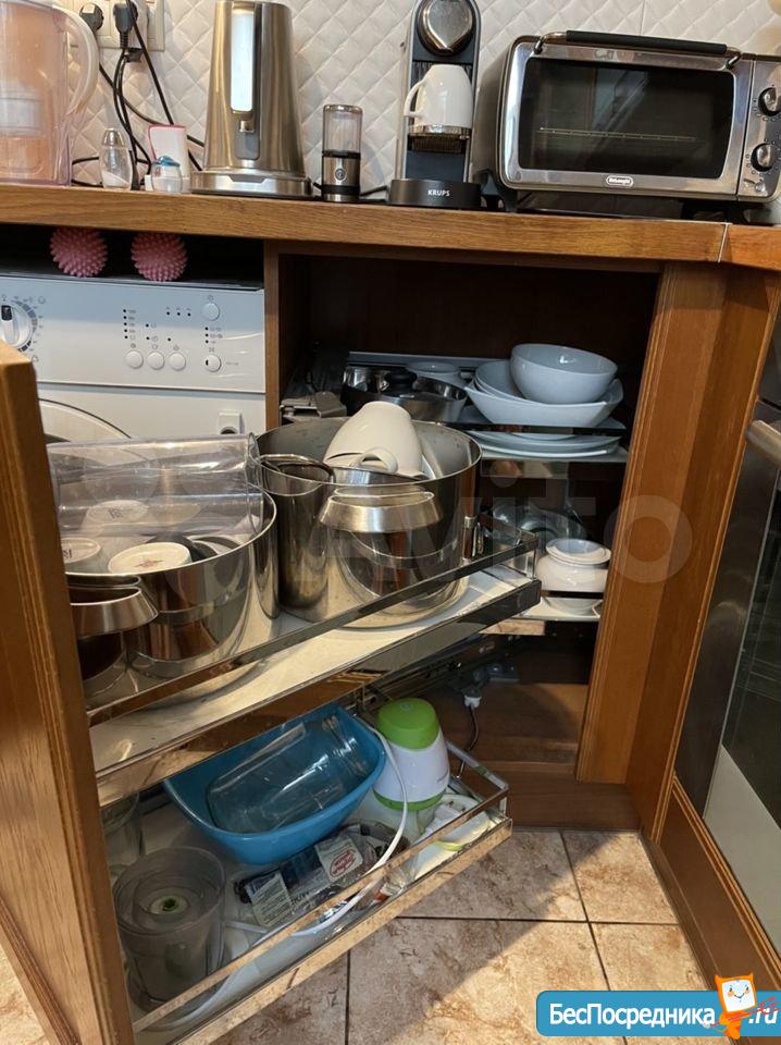 Кухня из массива дуба с дорогой техникой (посудомоечная машина, газовая варочная поверхность, стиральная машина с сушкой, двухкамерный холодильник, микроволновая печь, духовой шкаф), фильтр, кофемашина, индукционная автономная плита и пр.