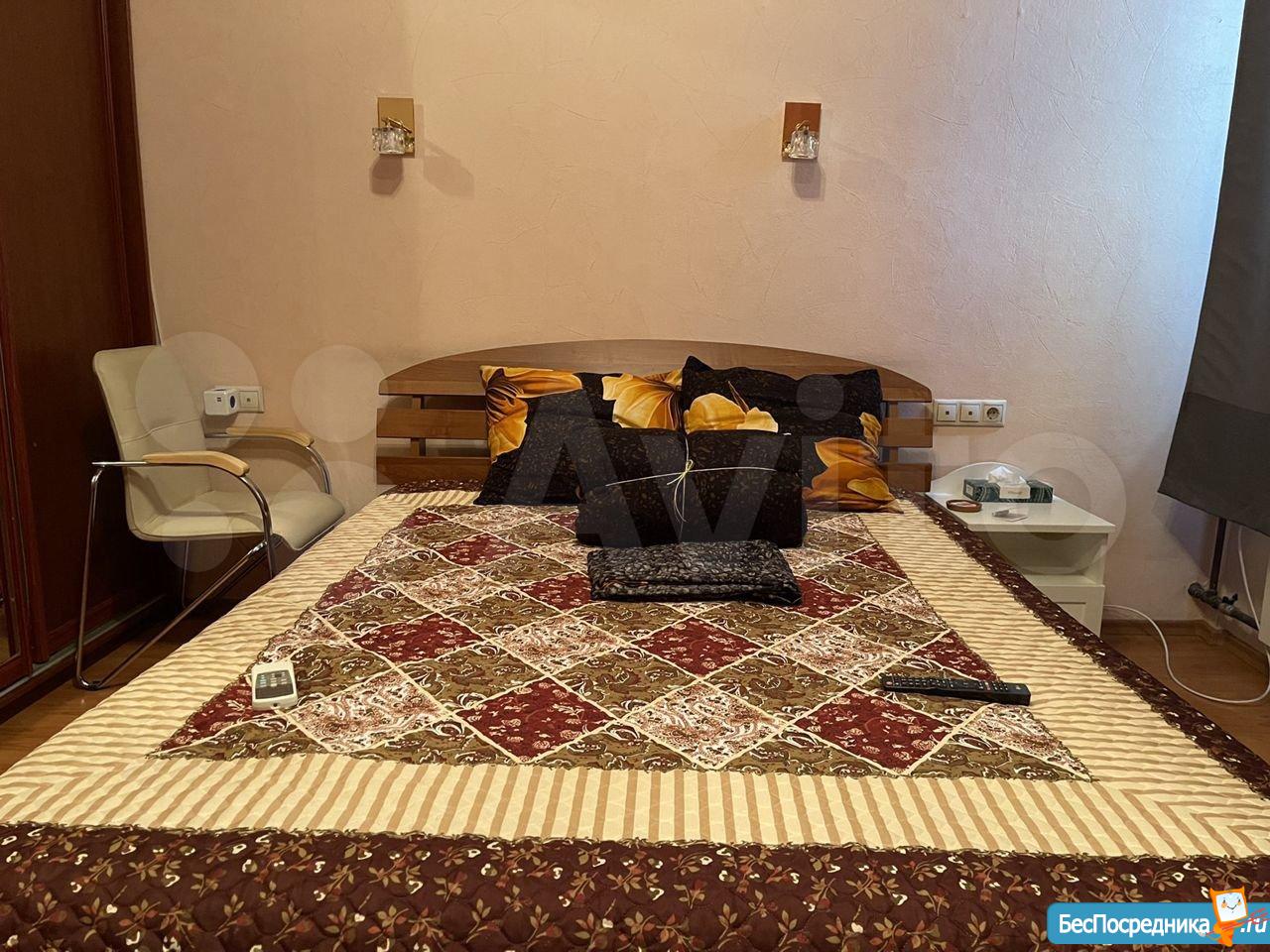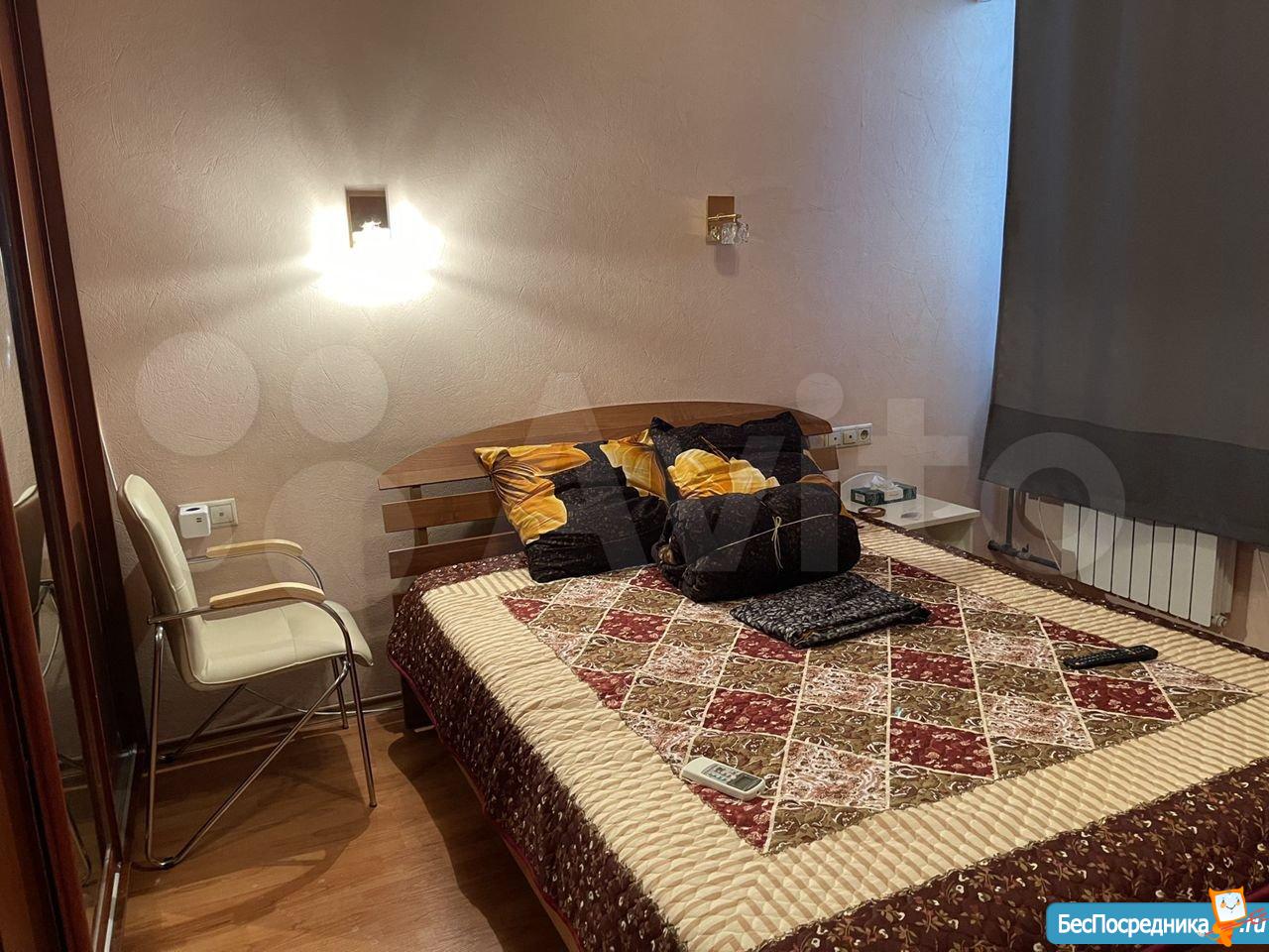 Гостиная оснащена диваном-трансформером, телевизором, креслом, спальня большой кроватью, платяным шкафом, туалетным столиком и тумбой.