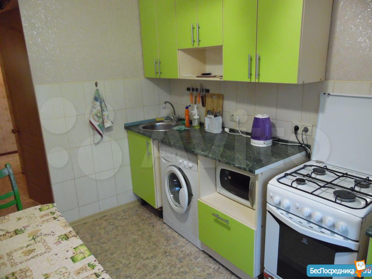 На кухне – холодильник, микроволновка, электрочайник, кухонный гарнитур, набор посуды, стиральная машинка-автомат.