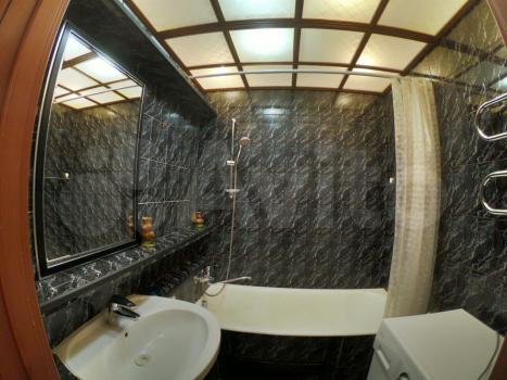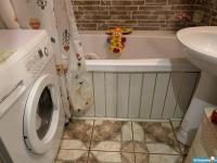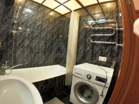 В ванной - дизайнерский мойдодыр, отделанный темным кафелем со шкафчиками и полками, ванна чугунная 175 см, стиральная машина LG новая( гарантия 10 лет), электрический полотенцесушитель