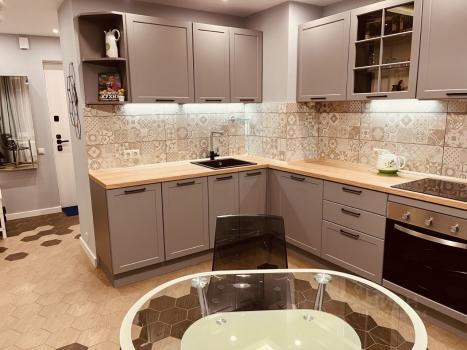 1.стир, тв 65" ", плита стеклокерам, кондиционер, пмм, Кровать 180х200 все новое, кухня встроенная, СУ в плитке.