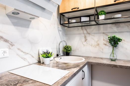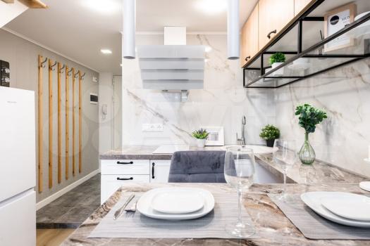 - на кухне: холодильник, варочная панель, духовой шкаф, вытяжка, посудомоечная машина, микроволновая печь;