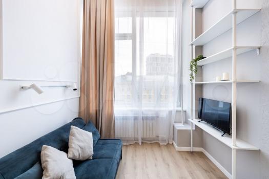 - в гостиной: раскладной диван, smart-TV, цифровое ТВ, интернет Wi-Fi 500 мб/с, кондиционер, шторы с электроприводом;