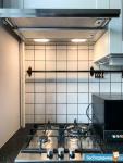 На кухне: новый гарнитур с сенсорными датчиками света над варочной панелью, обеденная зона и бытовая техника (стиральная машина, встроенный холодильник, вытяжка, микроволновка, электрический чайник, газовая варочная панель).