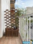 Открытый балкон со складной садовой мебелью, диким виноградом и гирляндами на солнечных батареях.