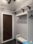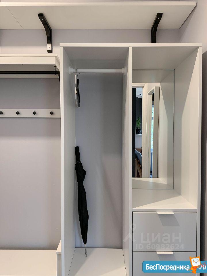 В прихожей: стеллаж для вещей, зеркало, обувница, настенные полки.