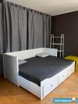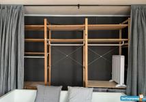 В комнате: большая раскладная двуспальная кровать с ящиками, система хранения (за серыми шторами много места для вещей), кресло-кровать, рабочее место, комод, журнальный столик, большое зеркало, стеллаж, обогреватель, регулируемое освещение, крепления для гитар. Под потолком скульптура Давида и Венеры, вывеска-указатель из метро с подсветкой.