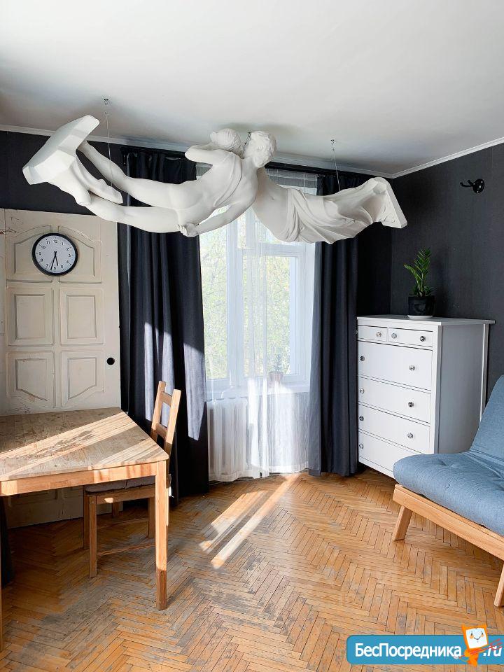 В квартире: одна светлая угловая комната 20 кв. м., совмещённый с/у, кухня, прихожая и балкон, а также хорошая мебель и арт-объекты. Сделан дизайнерский ремонт.