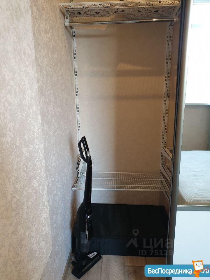 В комнате двуспальная кровать, вместительный шкаф для хранения и зона рабочего места. Есть телевизор. В прихожей также зона хранения во всю стену (до потолка). Санузел объединённый, есть стиральная машина. Вся техника в рабочем состоянии.