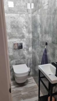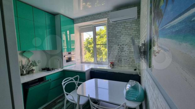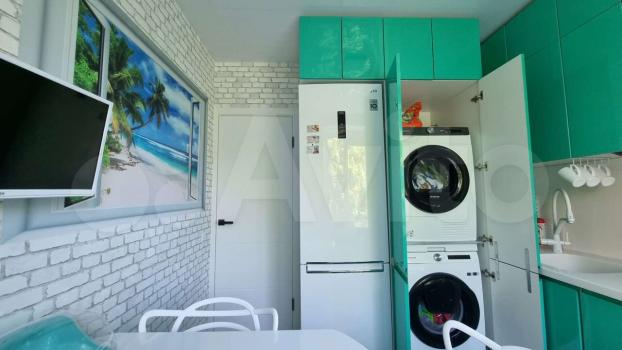 На кухне вся необходимая бытовая техника: встроенные посудомойка, духовка, свх, измельчитель пищевых отходов, а так же чайник, тостер, вафельница. Кухня совмещена с гостиной, где стоит удобный мягкий диван и висит LCD проектор, подключенный к медиаплееру Xiaomi Mi Box с выходом в интернет.