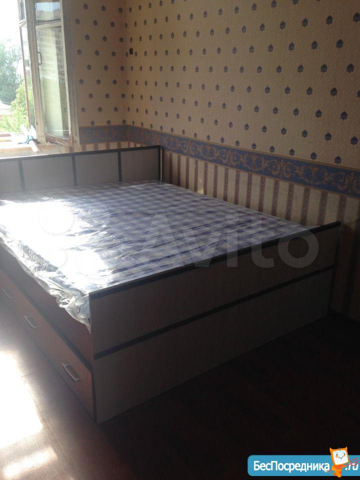 Что есть в комнате: двуспальная кровать, стенка для мелочей, доска гладильная, утюг, стол, микроволновка, холодильник, встроенный шкаф купе.