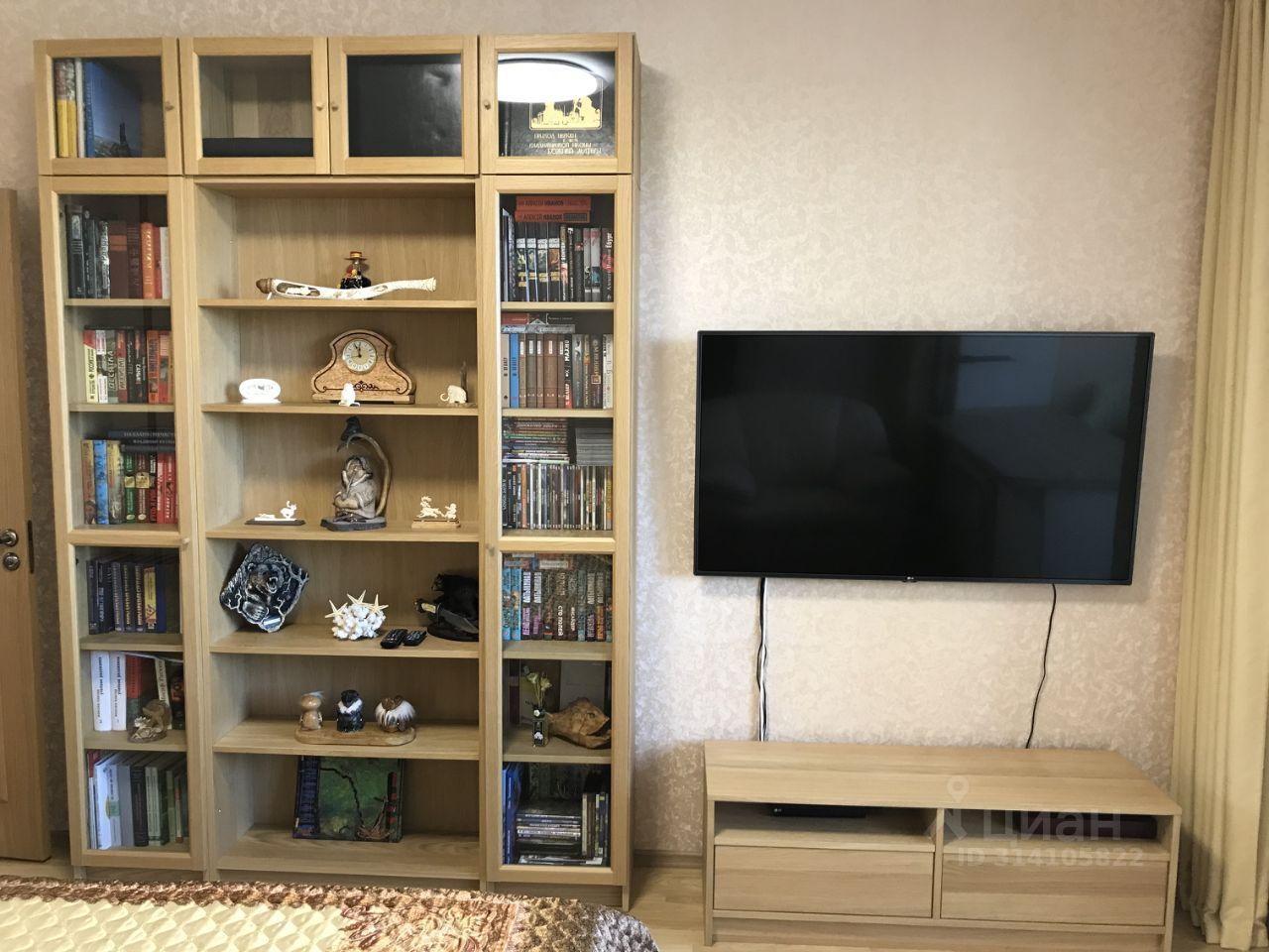 В зале есть раскладывающийся диван, кресло, шкафы, телевизор.