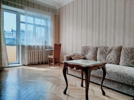 Жилая изолированная комната 18 м2. В ней - диван с ортопедическим матрасом, большой шкаф, столик. Кухня: 6,5 м2. Потолки 3,50 м. Квартира после косметического ремонта. На кухне современный гарнитур, холодильник, газовая плита, микроволновая печь. Газовая колонка - всегда горячая вода. Балкон в комнате. Интернет. С/У раздельный. Стиральная машина. Полы паркет. Окна ПВХ, в тихий двор. Квартира очень теплая. Въезд под шлагбаум.