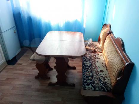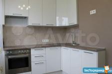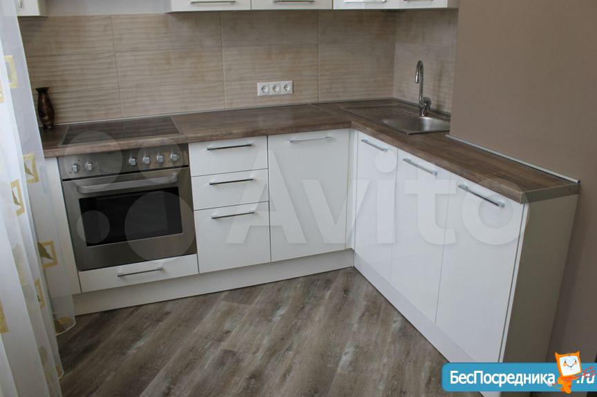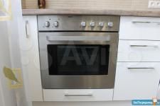 Полностью оборудованная кухня: холодильник, столешница со встроенной электрической панелью ARISTON, духовка, микроволновая печь, стол, диван.
