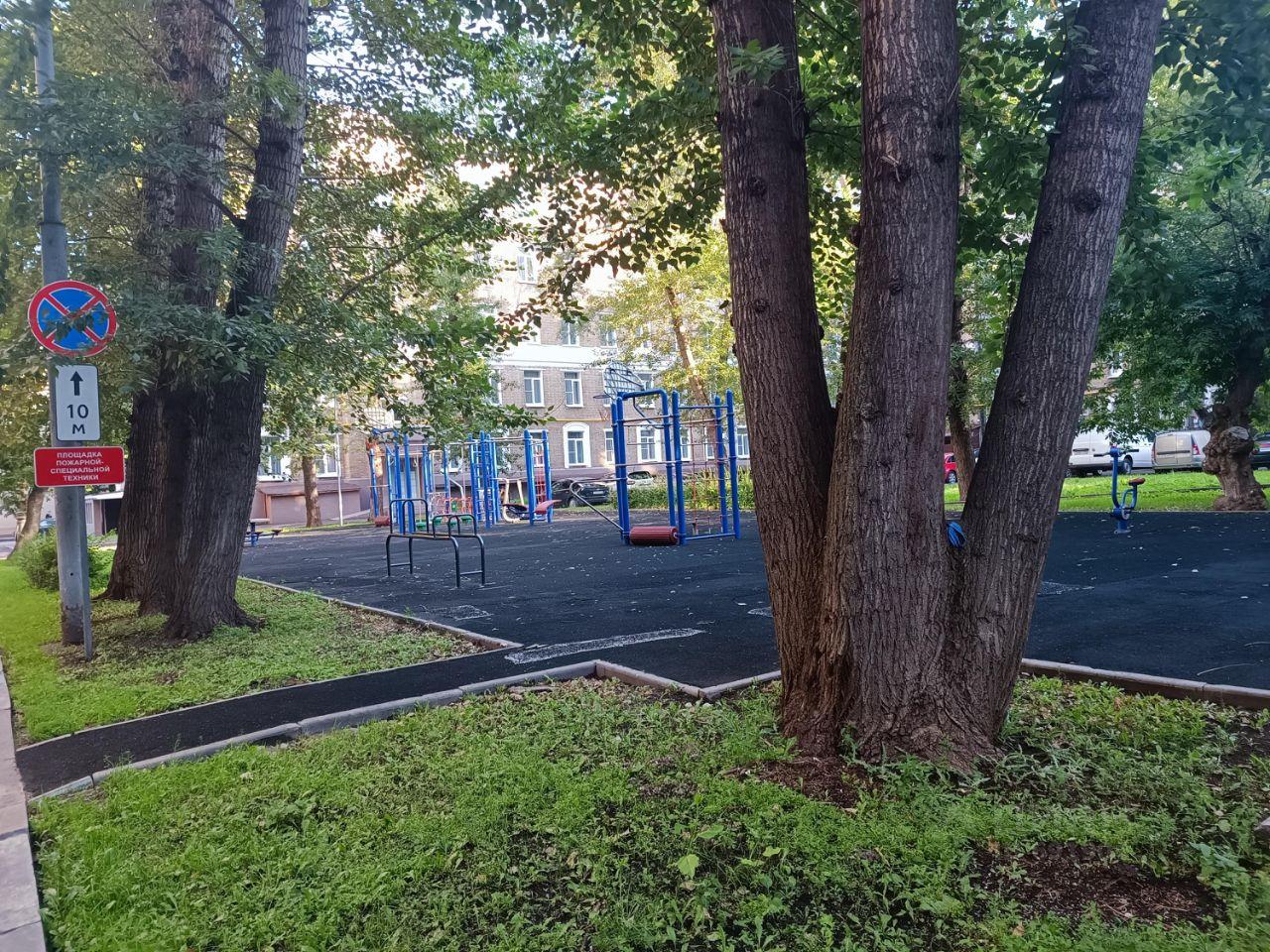Во дворе спортплощадка с тренажерами и детская площадка.