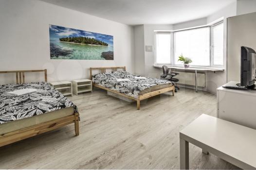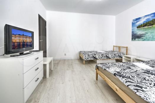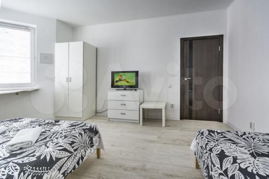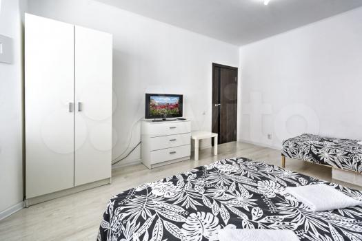 1 комната- кровать 160х200, кровать 100х200, ТВ, комод, платяной шкаф, стол, компьютерное кресло, светильник, люстра, пастельное белье.