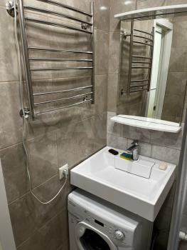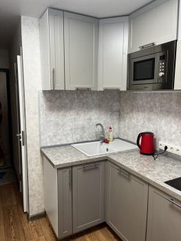 Обжитая однушка с современным евроремонтом и всей техникой. Обустроенная кухня: микроволновка, новый холодильник, газовая плита с духовкой, вместительные ящики. Только поставил новую ванну, зеркало и умывальник. В большой комнате два кресла, стенка, шкаф-купе во всю стену, и две односпальные кровати: можно совместить в одну или поставить раздельно.