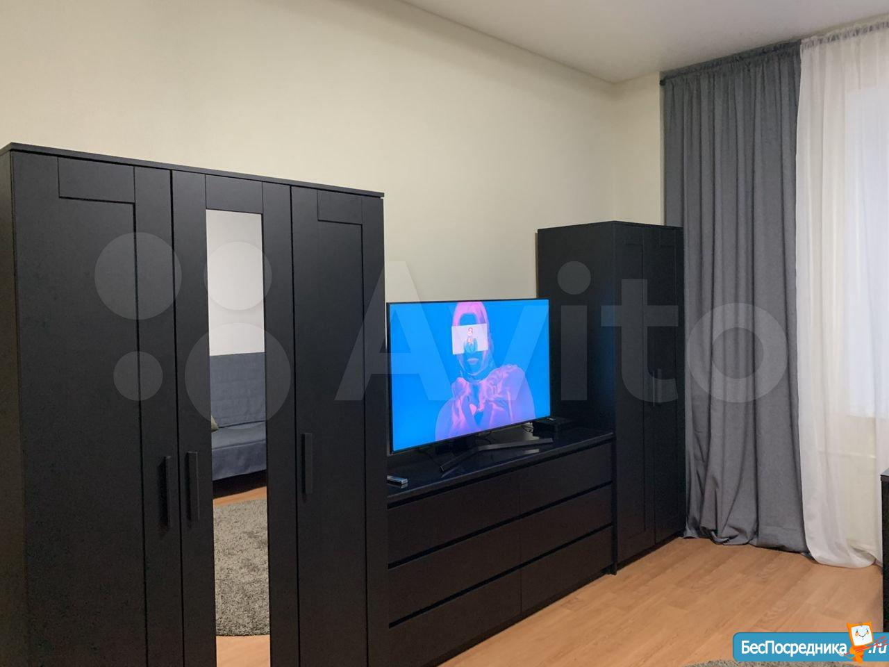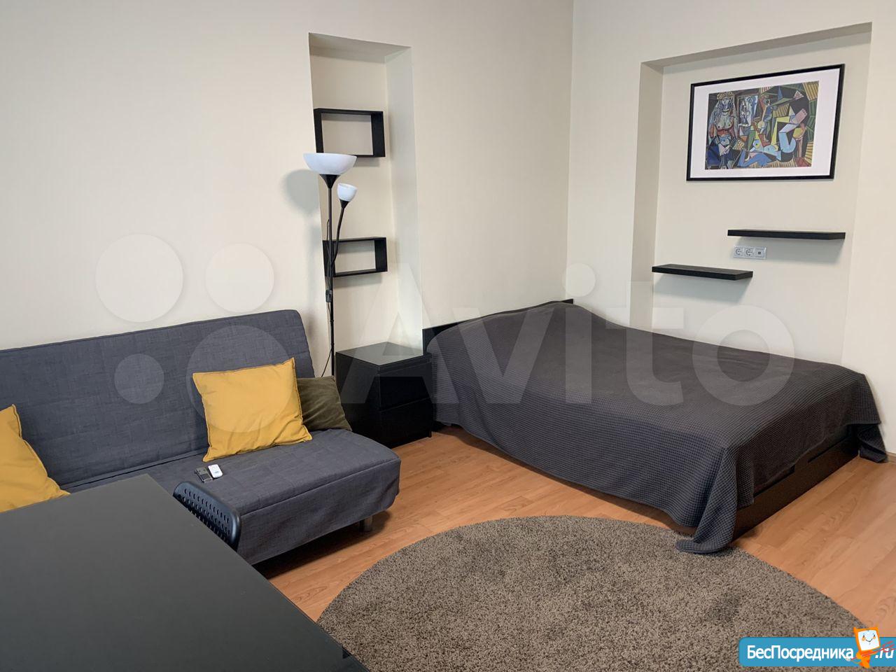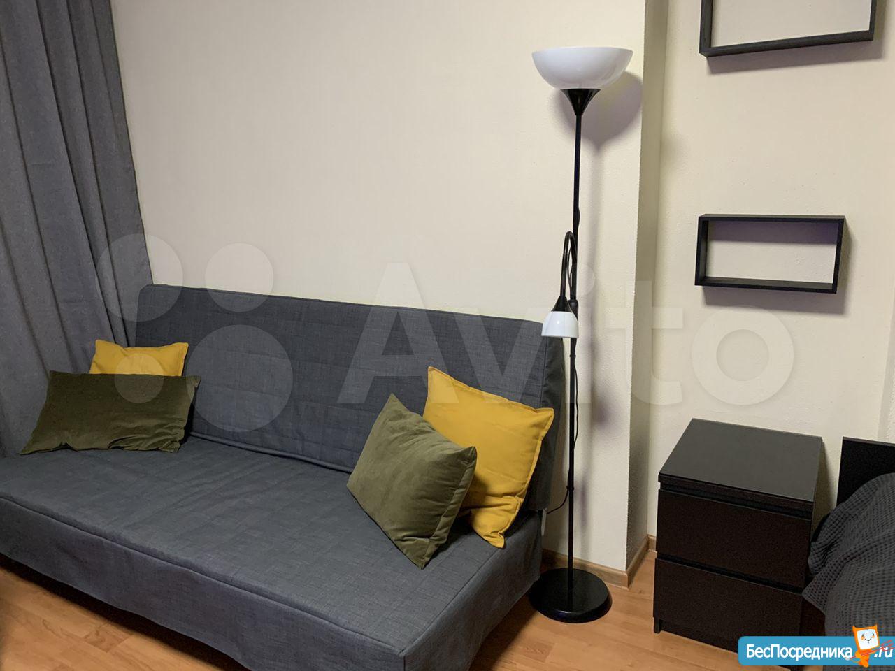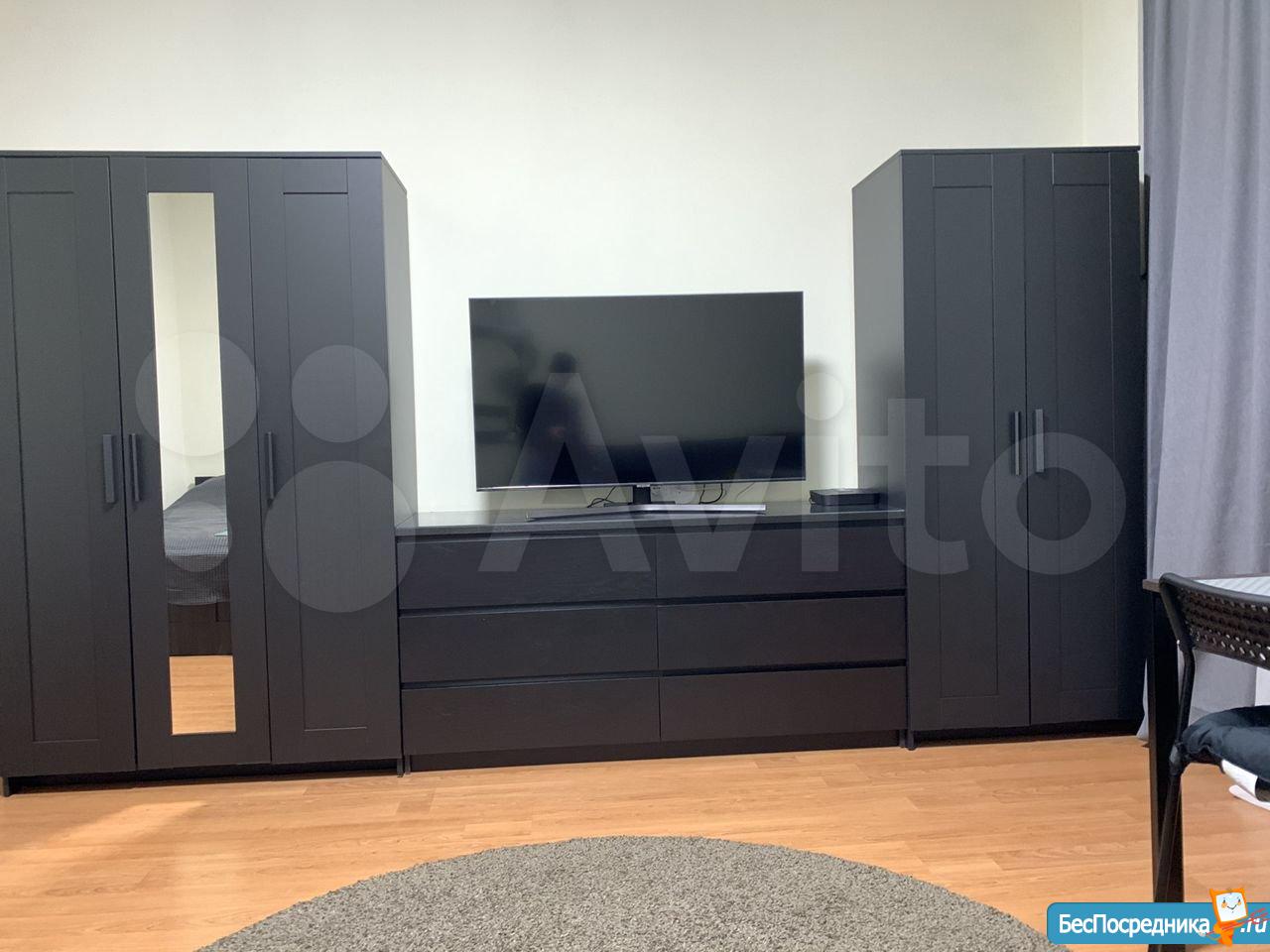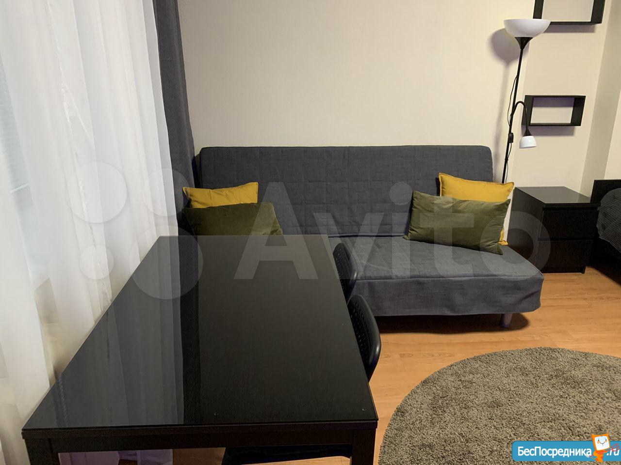 Студия. Отличный ремонт. Новая кухня, вся посуда, техника и мебель имеется: холодильник, мультиварка, шкафы, стол, диван (раскладывается в двуспальный), стиральная машина, кастрюли, сковородки, столовые приборы. Залог за 1 месяц.