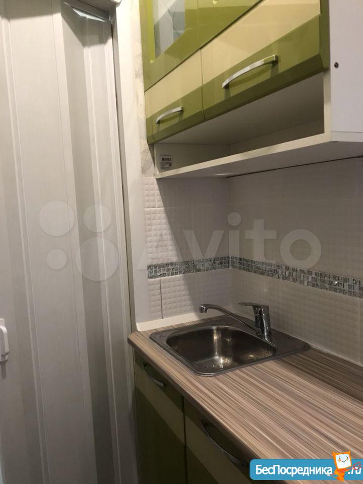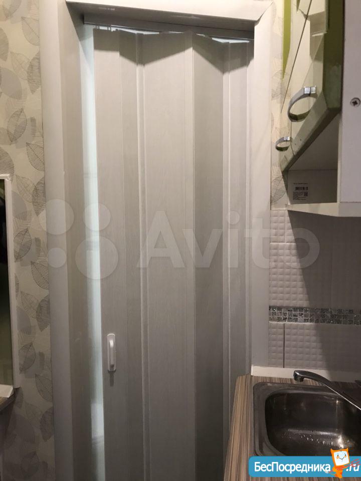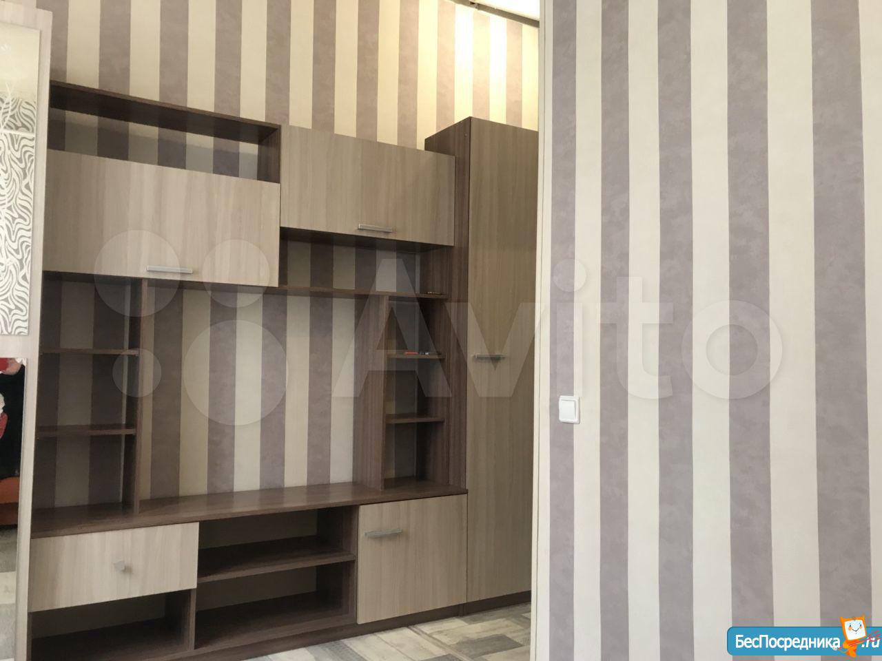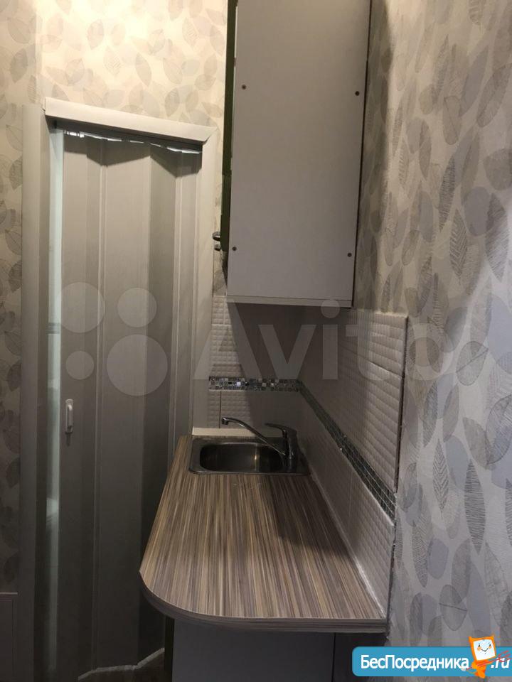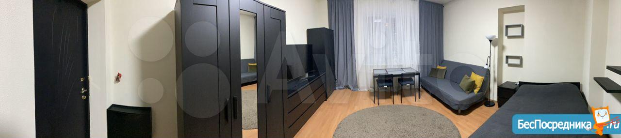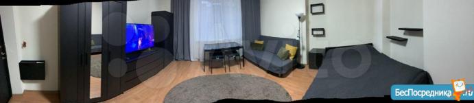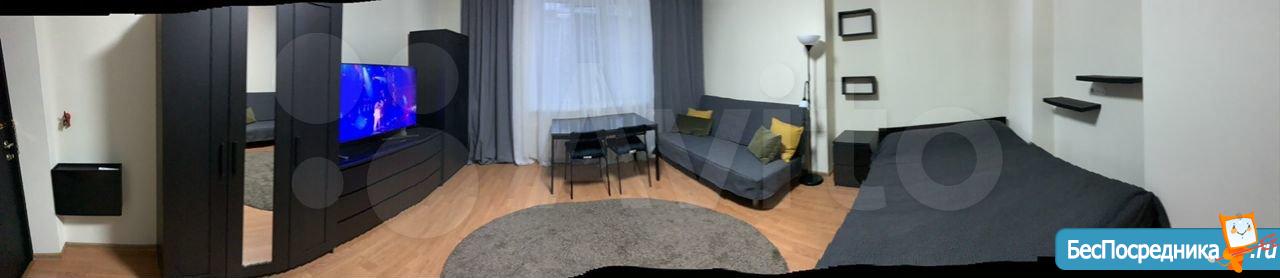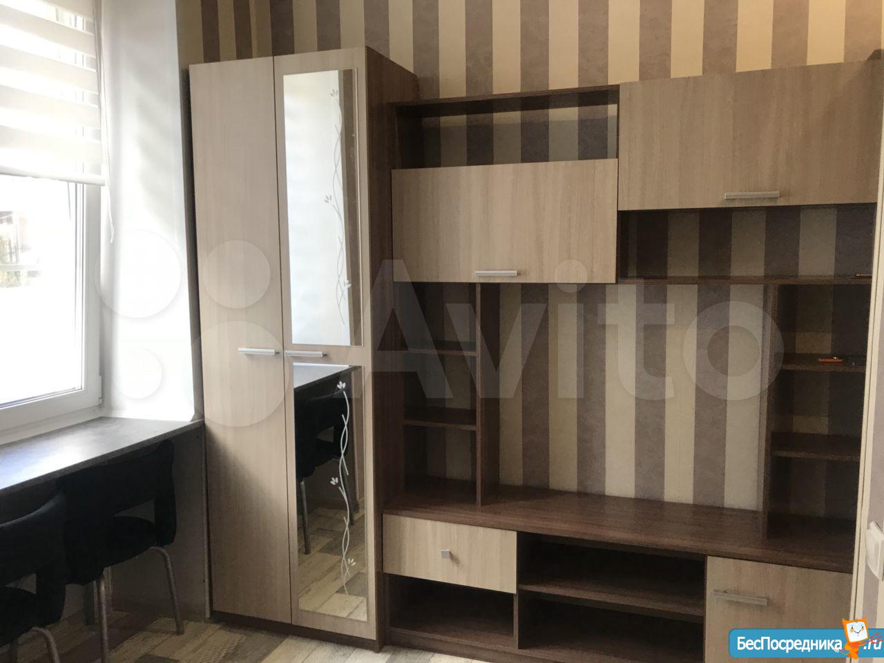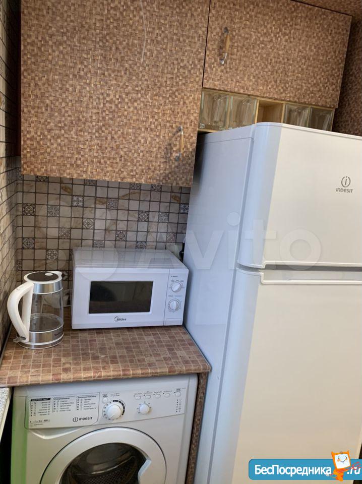 Студия. Отличный ремонт. Новая кухня, вся посуда, техника и мебель имеется: холодильник, мультиварка, шкафы, стол, диван (раскладывается в двуспальный), стиральная машина, кастрюли, сковородки, столовые приборы. Залог за 1 месяц.
