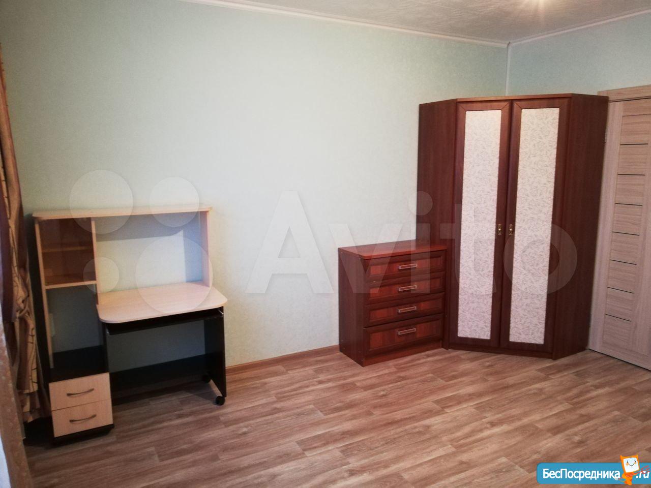 В комнате есть шкаф, кровать, сервант, тумбочка, трюмо. (всю мебель и косметический ремонт можете заменить на свое усмотрение и за свой счёт)