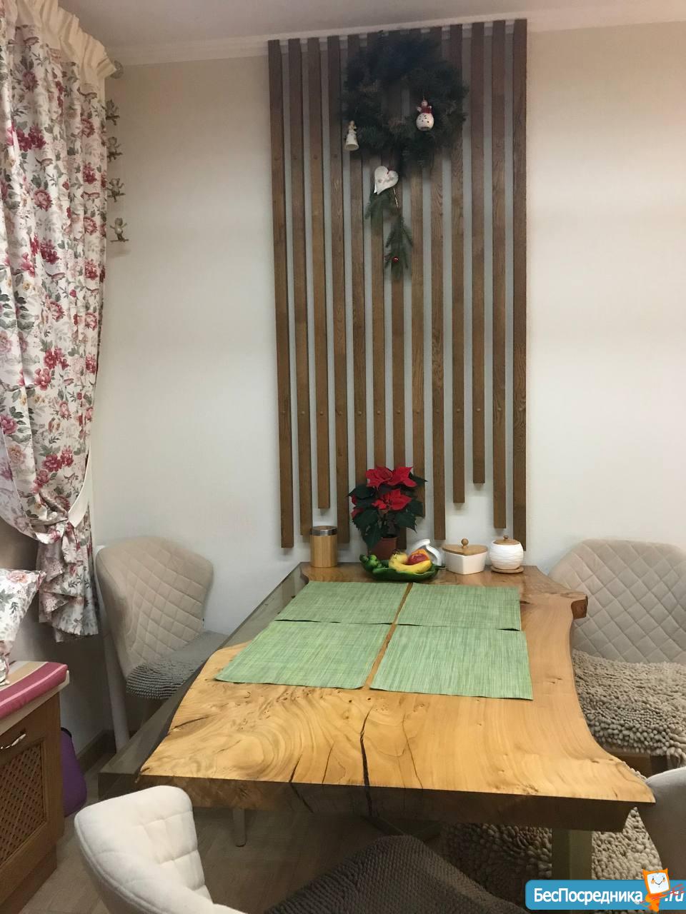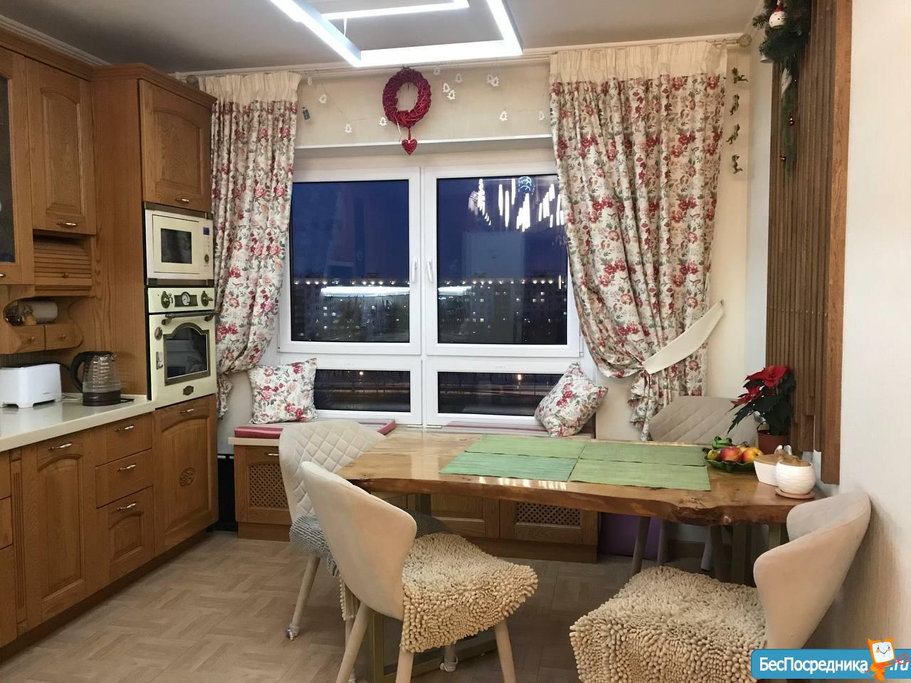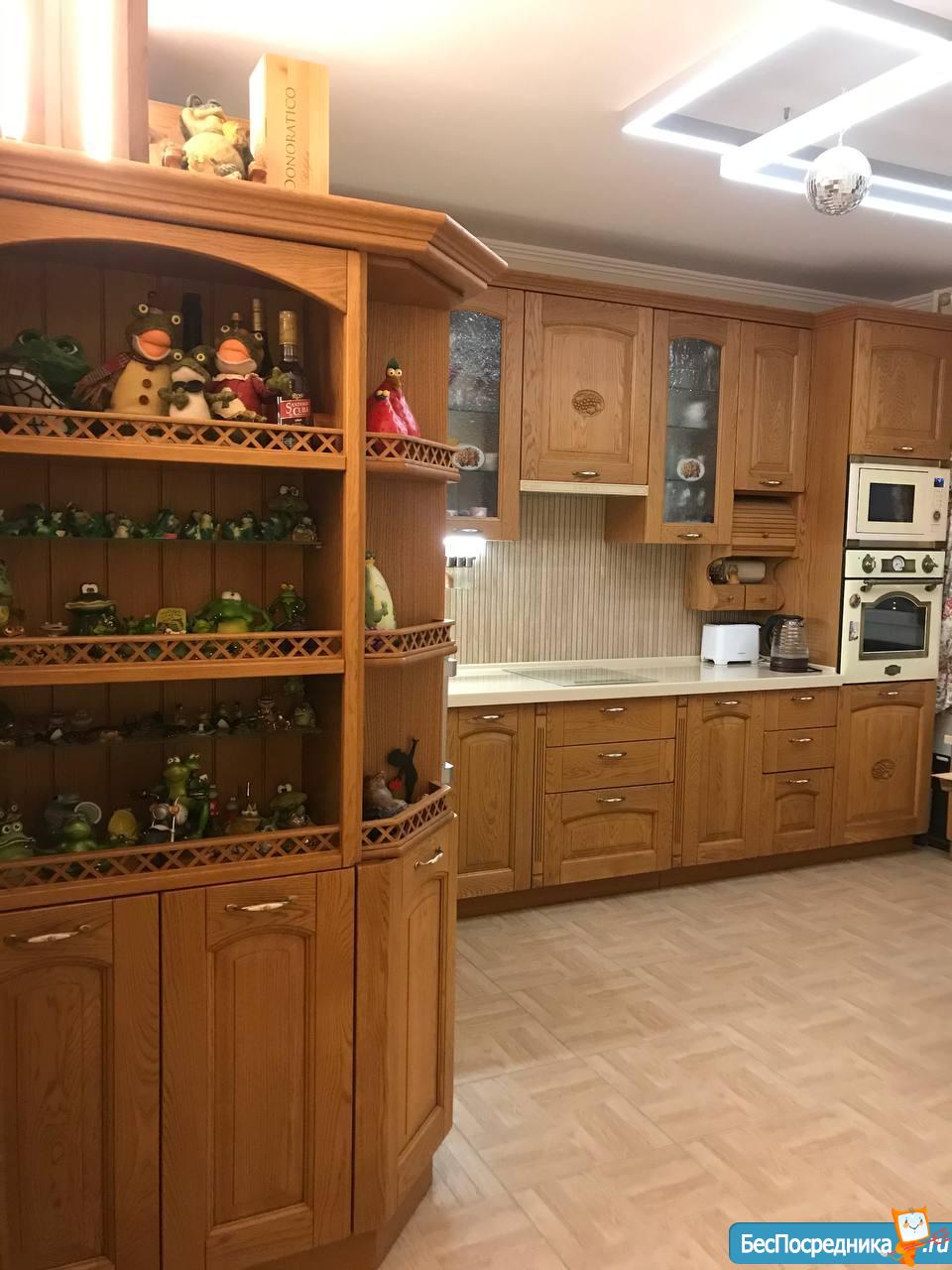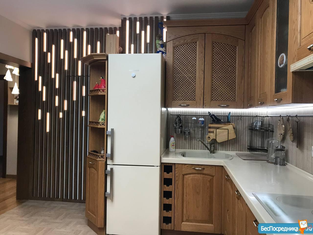 Кухня около 20 м2, встроенная мебель с деревянными фасадами, стеновая панель из дерева с точечной подсветкой, 2 виде освещения, современная новая техника VIP Kaiser - встроенный духовой шкаф и микроволновка, 3-комфорочная панель, вытяжка, литая большая столешница. Новый холодильник Liebherr. На кухне полы с подогревом.