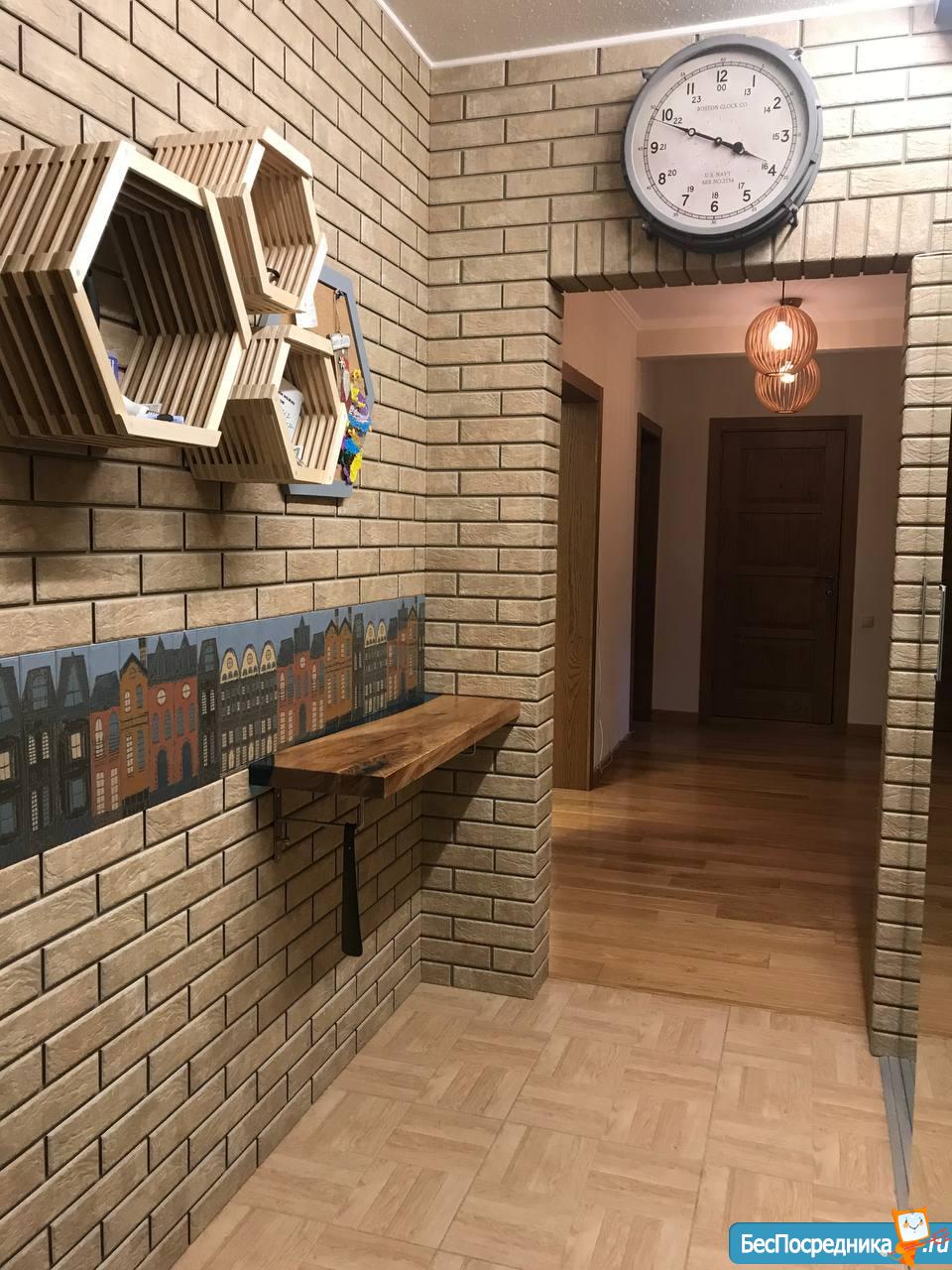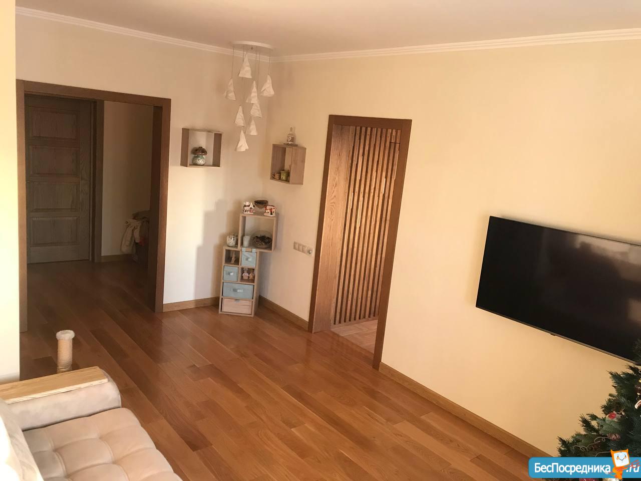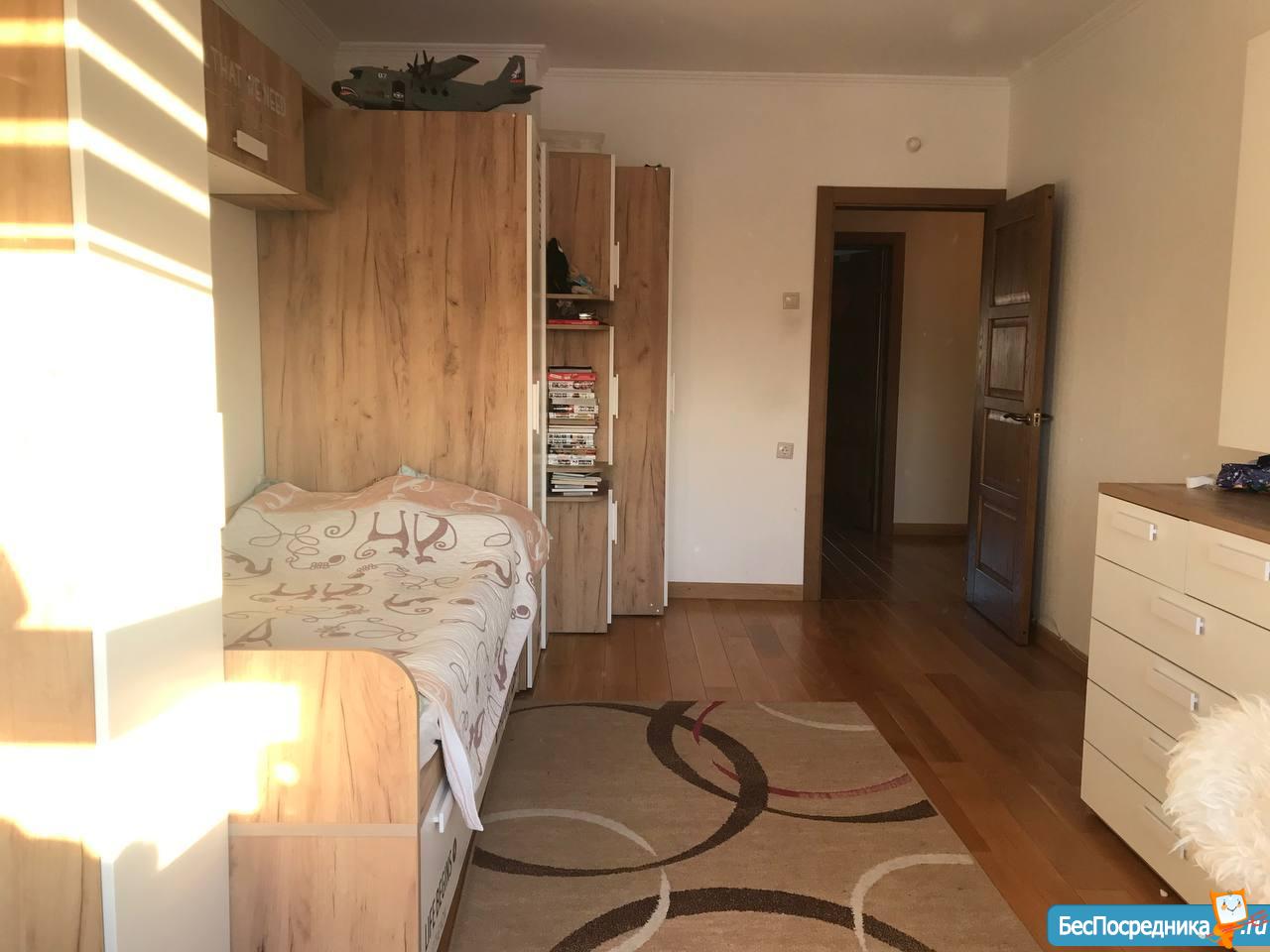 Прихожая с гардеробом и большим трехдверным стеклянным шкафом, изолированные спальни (две спальни детские 20м2, одна взрослая с большой кроватью и гардеробом), свободная гостиная с арочным входом в кухню.