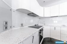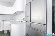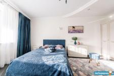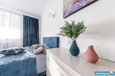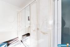В квартире спальня площадью 18 кв.м., кухня-гостиная площадью 24 кв.м., оборудованная гардеробная комната, коридор, санузел раздельный, большая лоджия. В спальне: шкаф, двухспальная кровать +2 прикроватные тумбы, ТВ, рабочий стол и стул. В гостиной кухонная мебель и техника, обеденная группа (стол+4 стула), угловой диван, мебель для гостиной (тумба для ТВ и 2шкафа). В коридоре: шкаф, вешалка, зеркало и пуф. Стиральная машина расположена в ванной комнате.