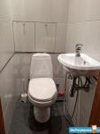 В туалете унитаз, гигиенический душ и раковина.