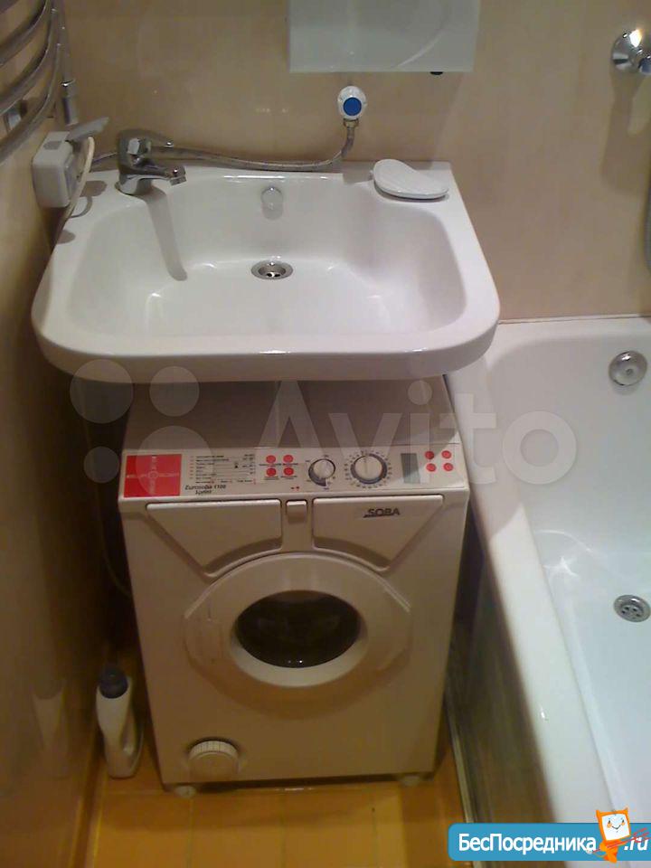 В ванной: вместительная ванная, большая раковина, стиральная машина автомат, большой настенный полотенцесушитель, зеркало с подсветкой.