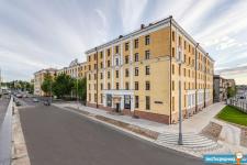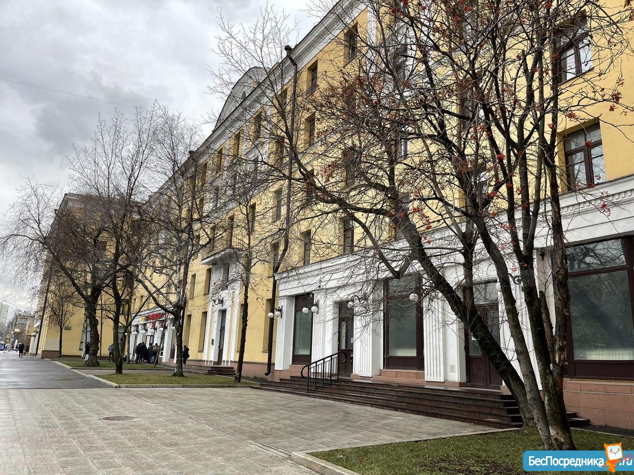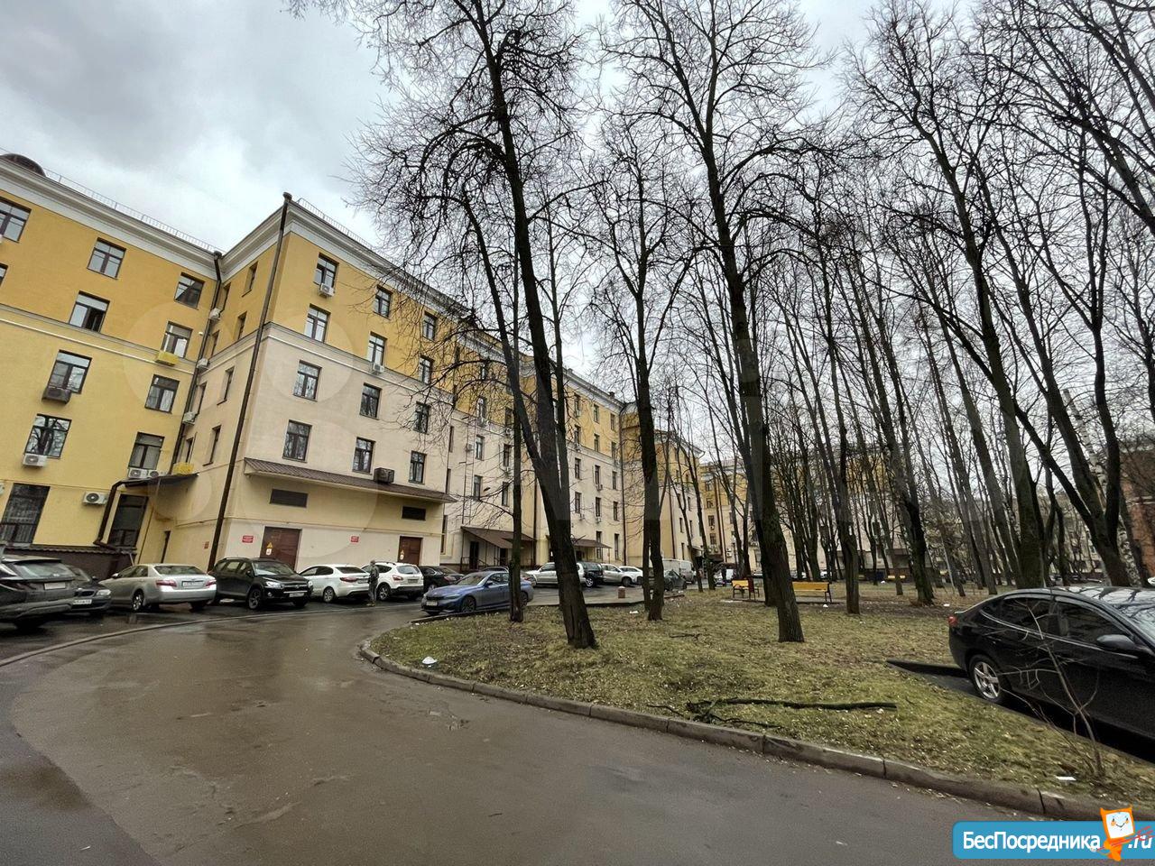 Дoм Сталинcкoй пocтpойки с высoкими пoтолками, во двoре сквеp.