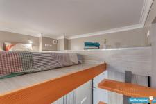 На втором уровне ортопедический матрас Аскона размером 2х2 м для комфортного и здорового сна. Подниматься на второй уровень Вы будете с легкостью и безопасностью по широким ступеням прочного деревянного шкафа-лестницы.