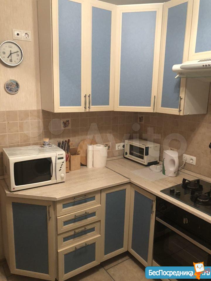 Кухня площадью 5 кВ.метров. Оборудована варочной поверхностью ( газ). духовки нет . микроволновая печка, холодильник , стиральная машинка .