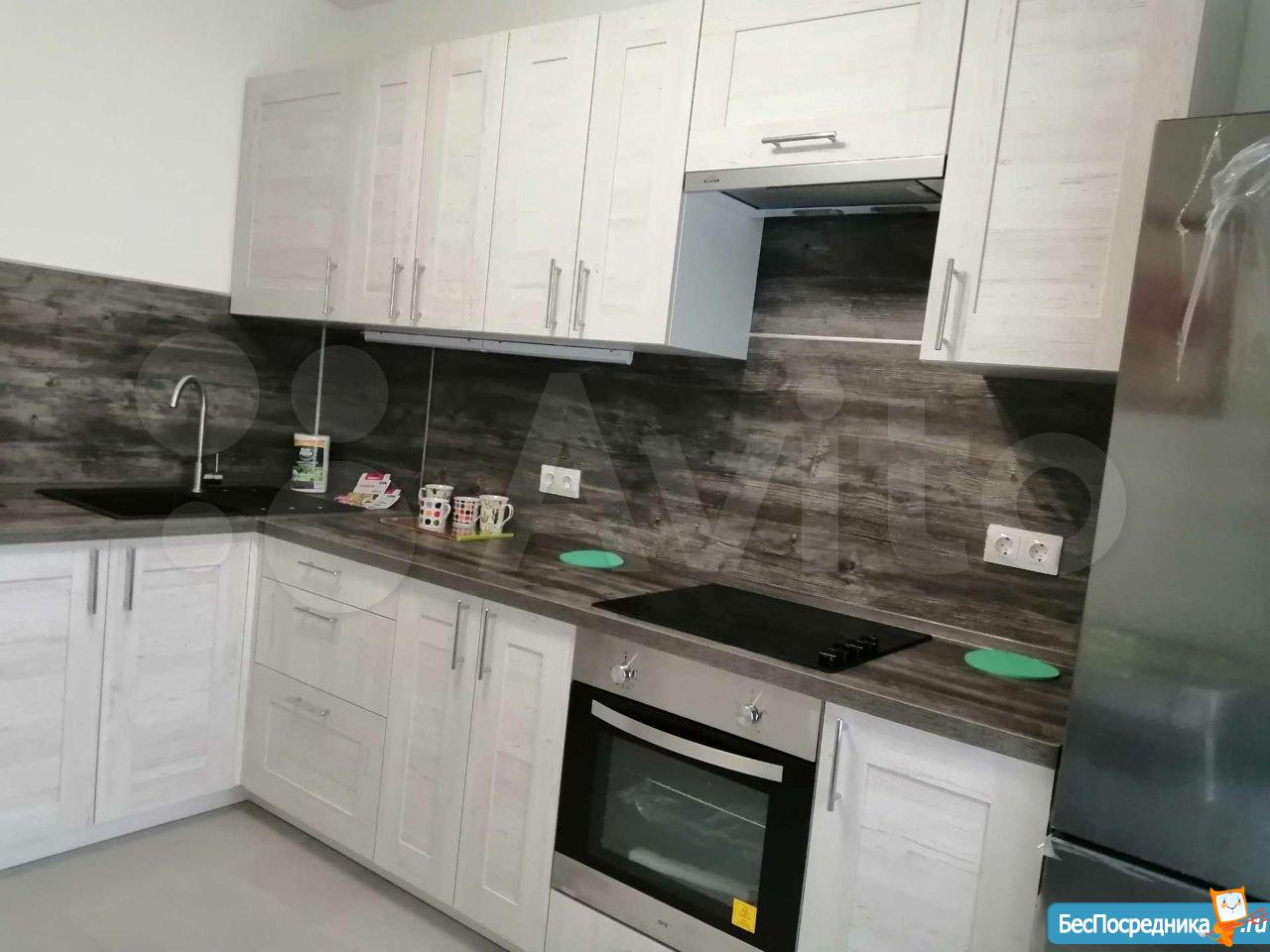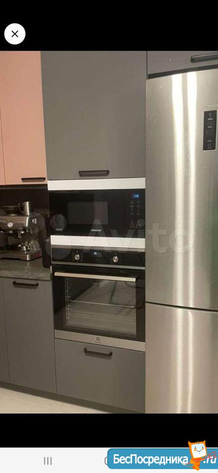 Современный вместительный кухонный гарнитур со встроенной духовкой с функцией СВЧ (микроволновка).
