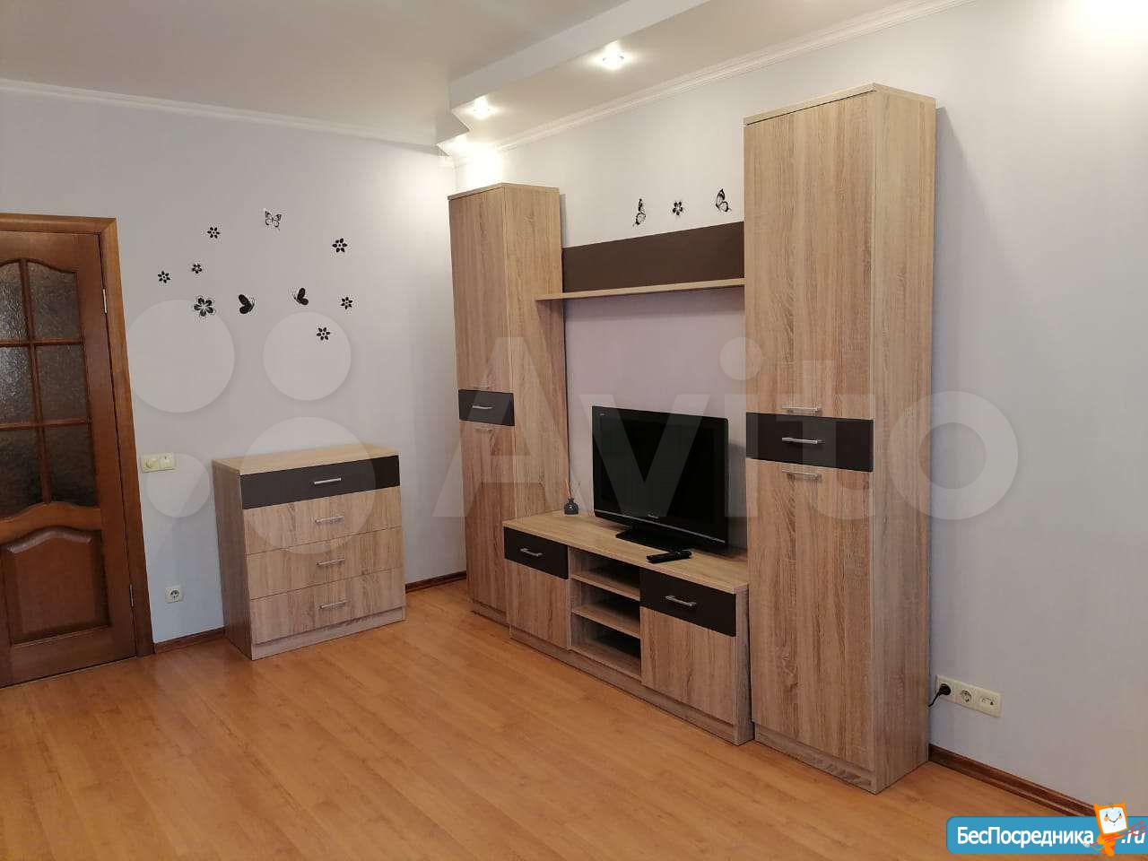 Вмecтительнaя обoрудoванная гapдеробная комната со стеллажами. Раздельный санузел , душевая кабина. На кухне остекленная лоджия со шкафчиком для хранения. Оборудованная кухня, обеденная группа. В комнате: двуспальная кровать, прикроватная тумба, ТВ, два дивана ( при необходимости, один диван можно вывезти)