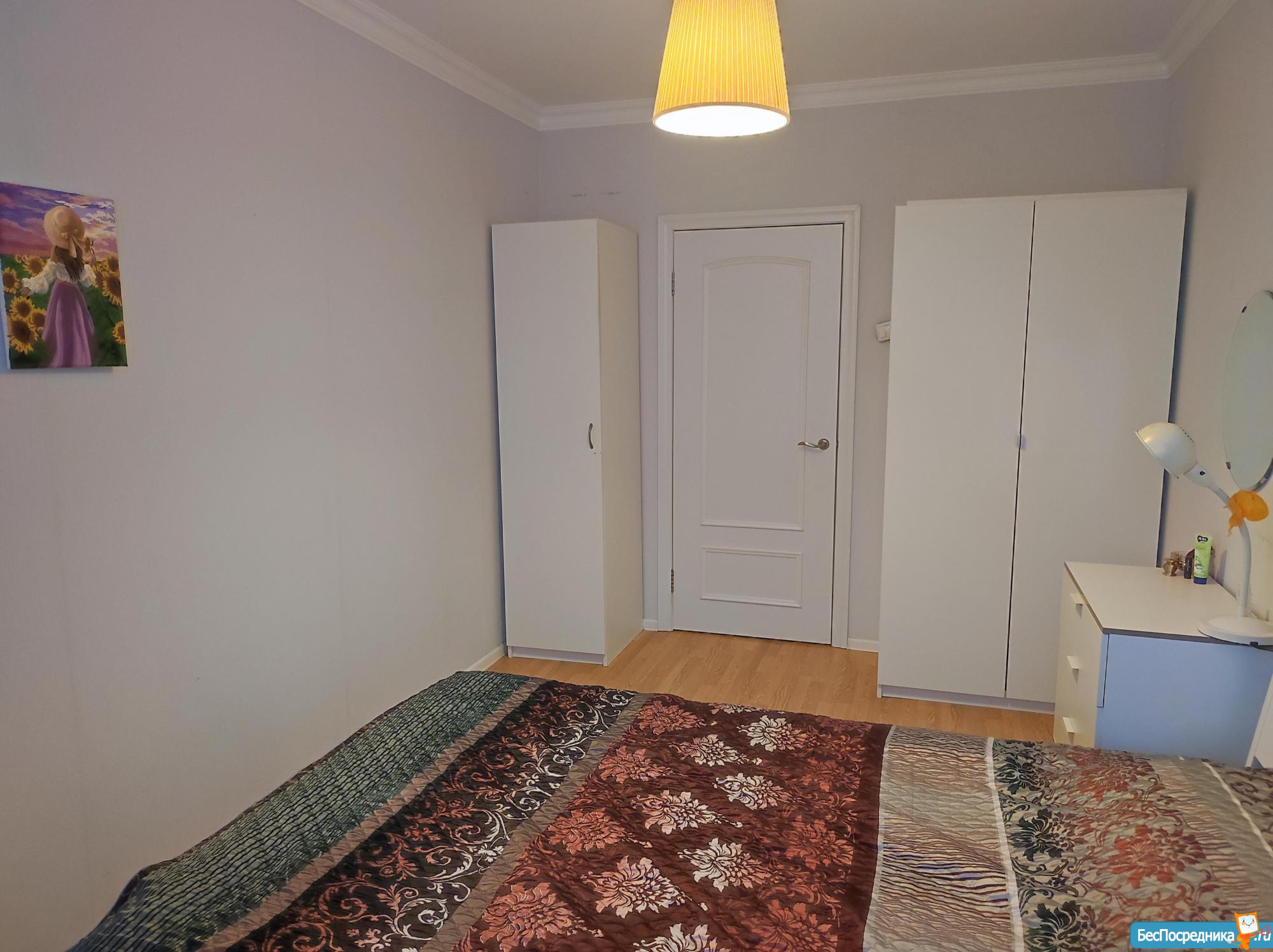 В спальне установлена новая большая кровать с новым дорогим матрасом, шкаф, косметический столик с зеркалом, smart TV.