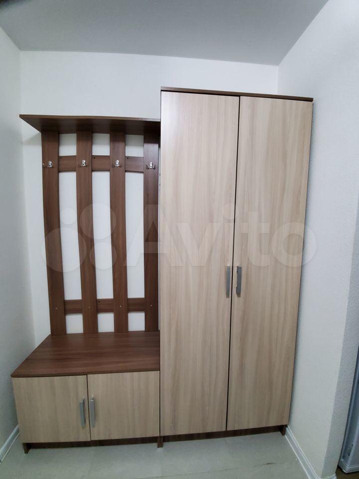 Мебель: кухонный гарнитур, обеденная группа (стол, четыре стула), диван раскладной двухспальный, шторы блекаут, стенка для хранения вещей, шкаф для ТВ, комод для хранения обуви в прихожей, вешалка, кровать двухспальная с ящиками для хранения, матрац, прикроватная тумба, удобный шкаф для одежды под потолок, комод для личный вещей, стул.
