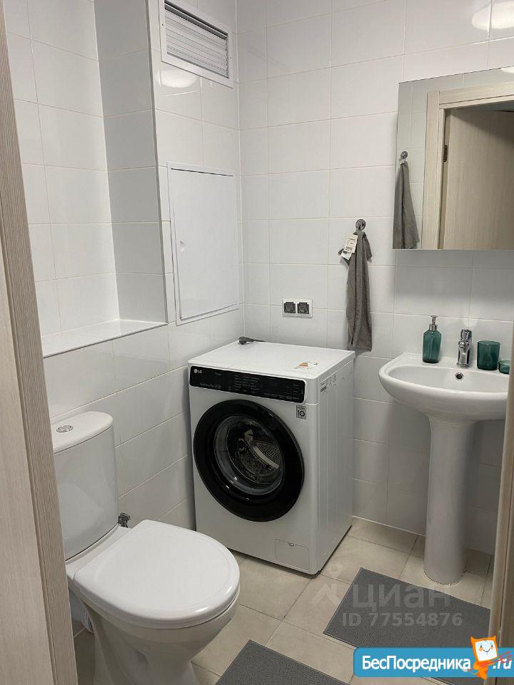 Санузел совмещен. Ванна, раковина, стиральная машина и зеркальная полка.