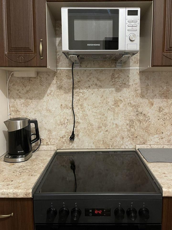 На кухне есть холодильник, телевизор, электрическая плита с духовкой, стиральная машинка, микроволновка, чайник с термопотом и столовые приборы и посуда.