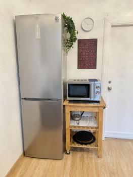 В наличии: стиральная машина, микроволновая печь, электрический чайник, фен, утюг, гладильная доска, пылесос.