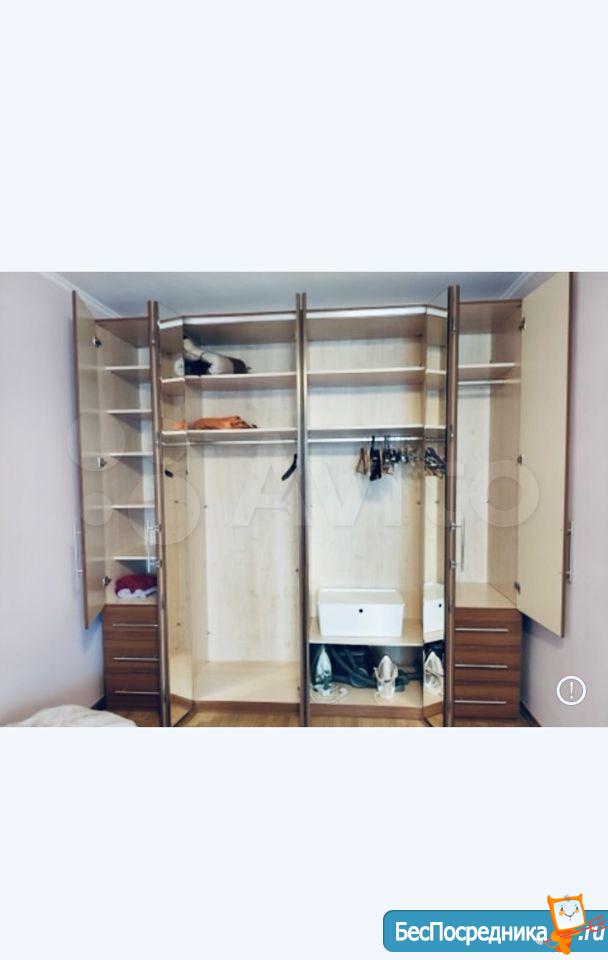 В комнате новая мебель. Двухспальная кровать и Шкаф-купе, тумба, телевизор.