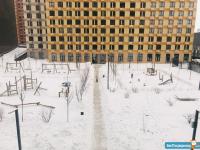 Двор внутренний без машин, современная детская площадка, ухоженный ландшафтный дизайн.