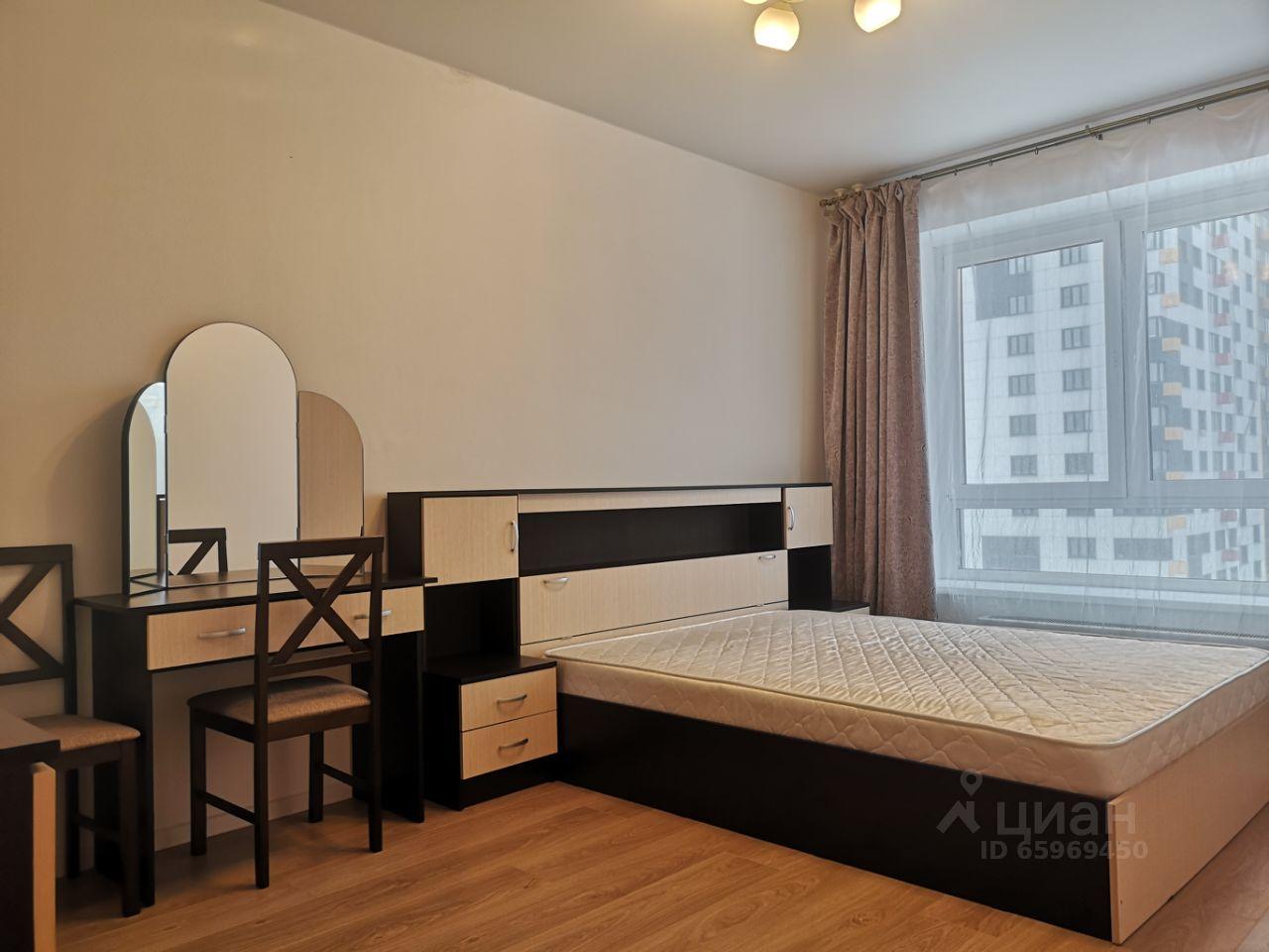 Окна выходят на восточную светлую сторону, во дворе благоустроенная детская площадка. В комнате присутствует большая кровать с тумбочкой, письменным столом и шкафом для одежды. В кухне имеется стол, четыре стула, холодильник, духовой шкаф и посудомоечная машина.