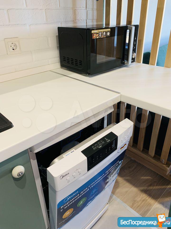 Есть все необходимое для жизни: холодильник, варочная панель, стиральная машина, посудомоечная машина, СВЧ, ТВ; жалюзи-блэкаут; продумана первоклассная система хранения - хватит для проживания двоих людей. Яркий раскладной диван, джутовый коврик.
