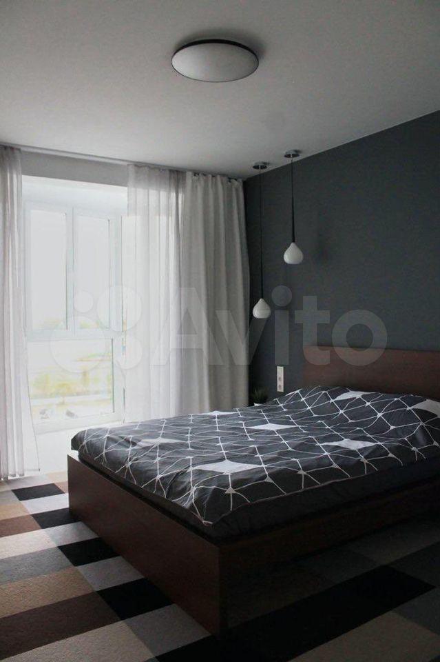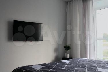 Мастер-спальня — кровать с мягким изголовьем, ТВ, выход на застеклённую лоджию