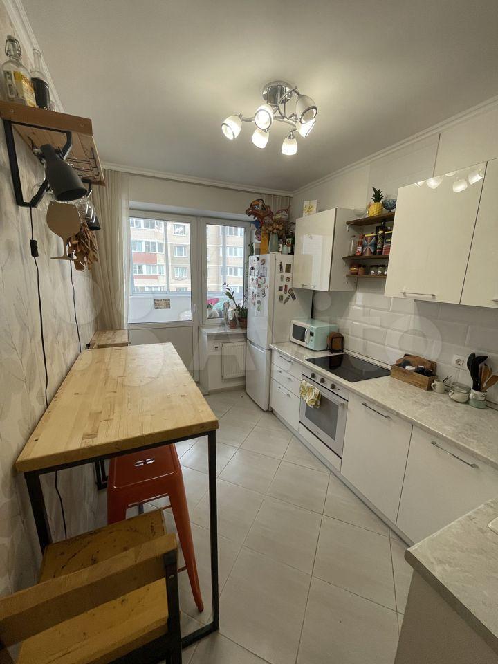 Светлая кухня площадью 9.20 кв.м с выходом на балкон. Помимо кухонного гарнитура остаётся встроенная посудомоечная машина, плита и печь.