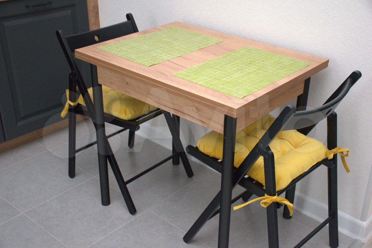 Кухонный гарнитур, обеденная группа, шкаф-купе, диван-кровать, открытый стеллаж в прихожей, пуфик, табуреты и прочие мелочи, а также есть свободное место, куда Вы можете поставить свои вещи, например, стол.
