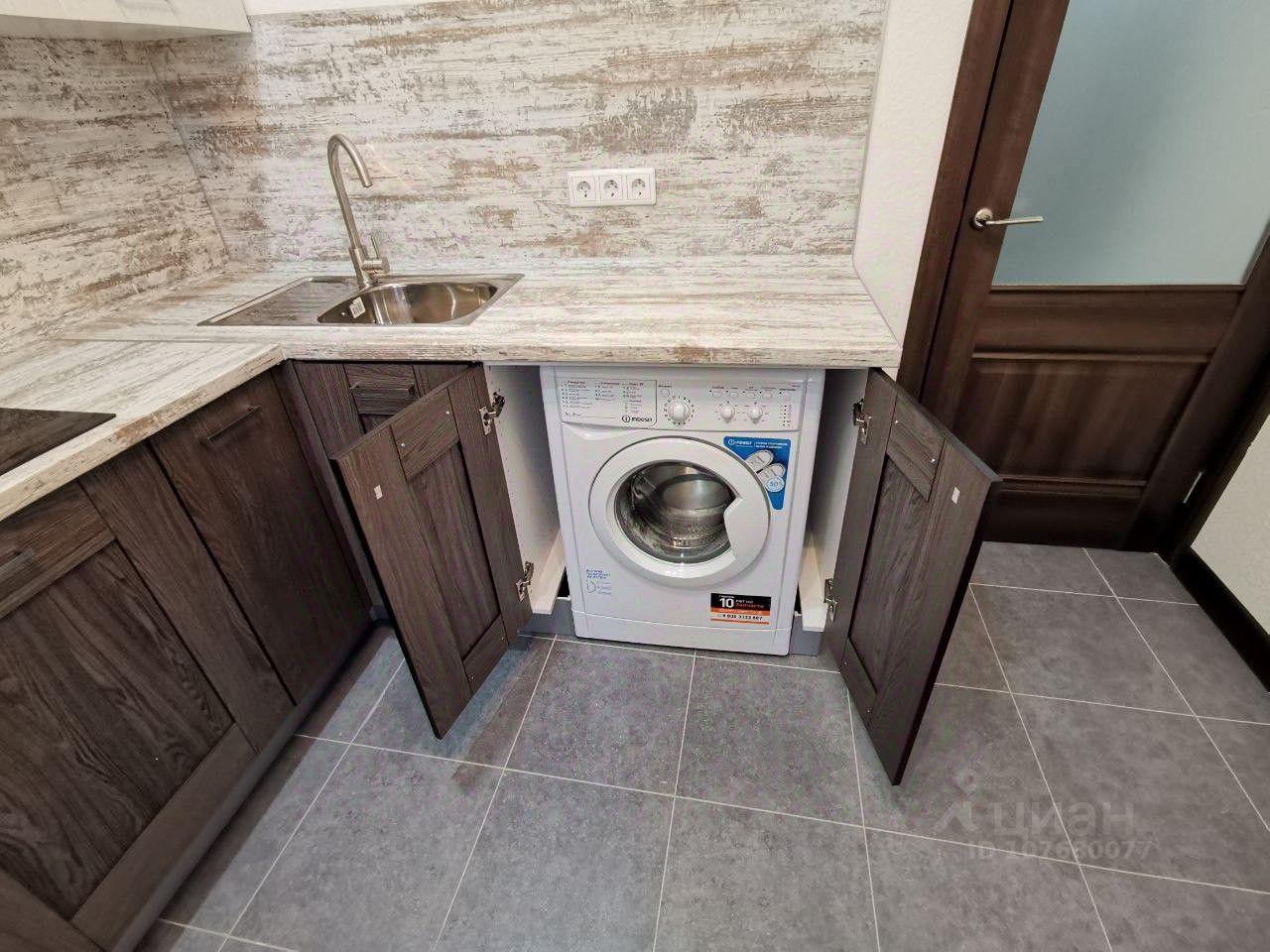 На кухне кухонный гарнитур, вытяжка, холодильник, варочная плита, духовой шкаф, стиральная машина, СВЧ (на фото отсутствует), электрочайник, раскладной обеденный стол.