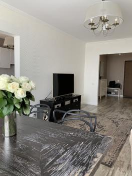 Общая площадь квартиры 82 кв.м без учета площади двух просторных лоджий с панорамным остеклением. В квартире: гостиная-столовая, кухня с дополнительным проходом в гостиную и с лоджией, спальня с просторной лоджией (приблизительно 5 кв.м), комната свободного назначения, раздельный с/у с большой ванной и системой против протечек воды, по настоящему просторная прихожая. Квартира полностью меблирована, во всех трех комнатах установлены кондиционеры, есть вся необходимая кухонная техника и кухонная утварь, стиральная машина, телевизор, Wi-Fi, домофон, светильники, зеркала, подушечки на диванах всё для ми-ми-шной жизни. Все окна выходят на южную сторону.