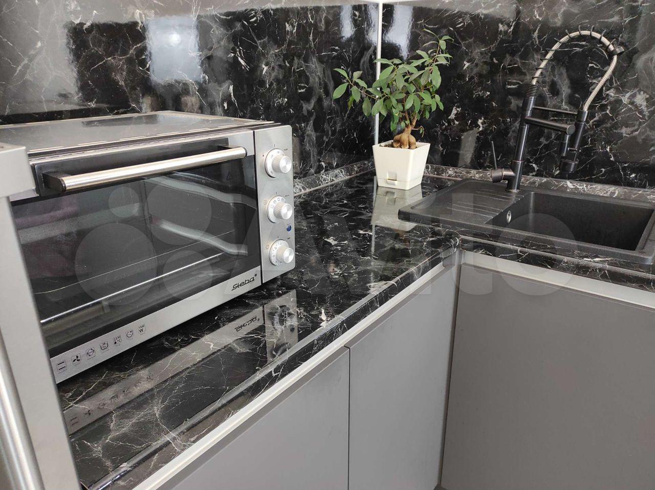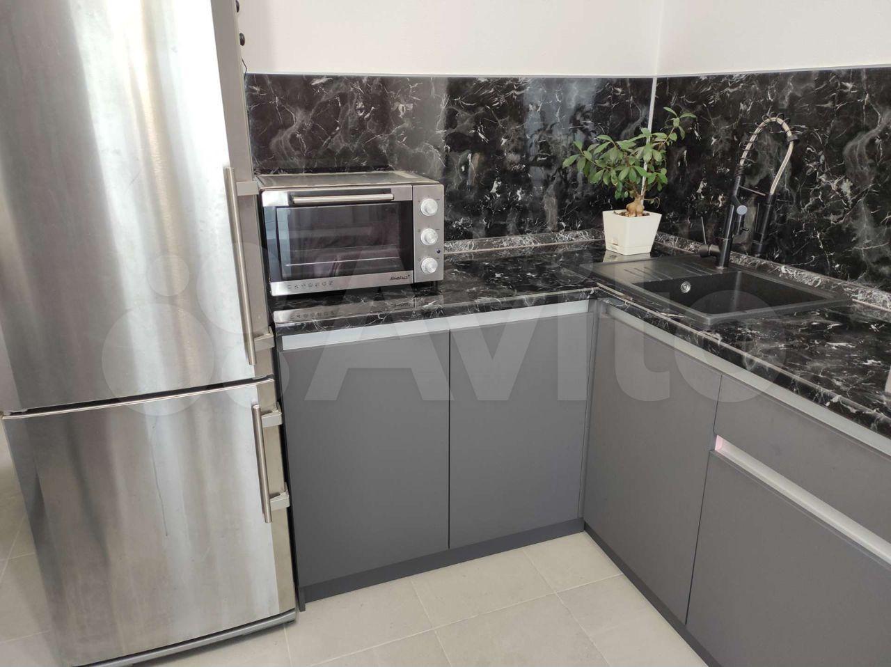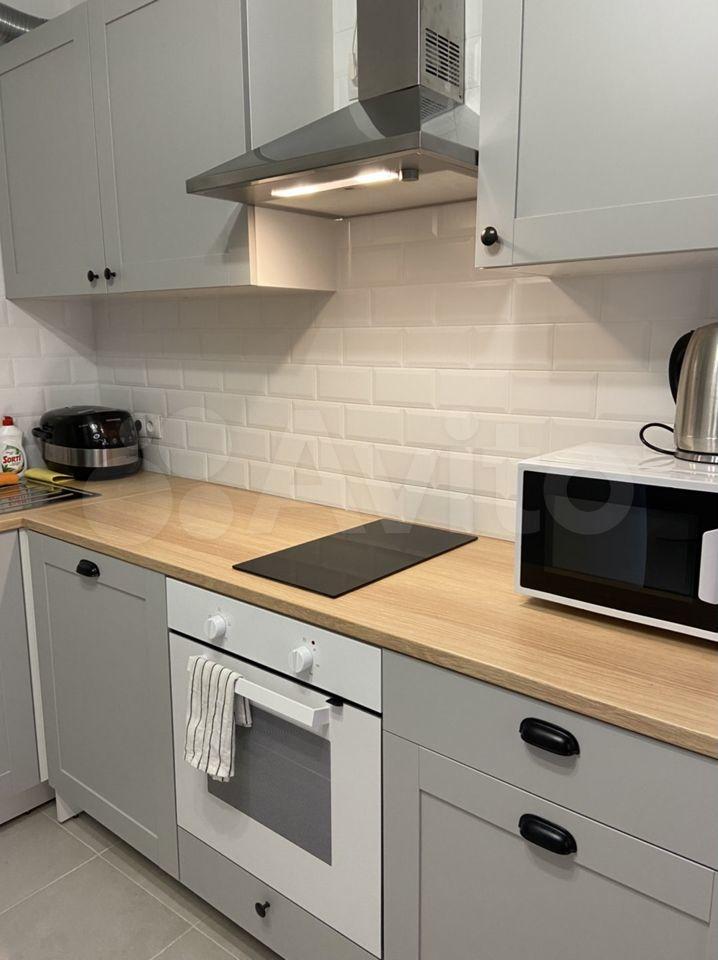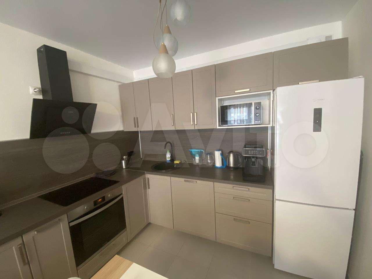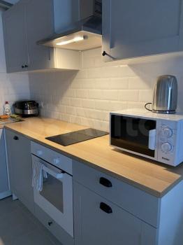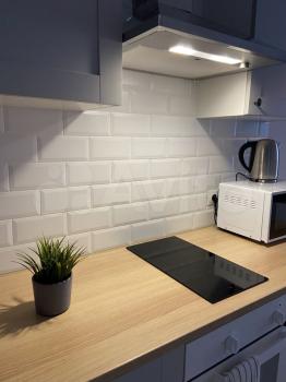 Вся необходимая техника: холодильник, варочная панель, духовой шкаф, микроволновая печь, чайник, стиральная машинка, утюг, гладильная доска, телевизор.