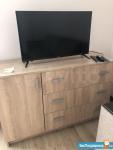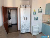 Санузел, кухонный гарнитур, кровать двухспальная, холодильник, электроплита, электрочайник, телевизор, микроволновка, стол, шкаф, стулья, стиральная машинка. Есть обустроенное кладовое помещение под гардероб.